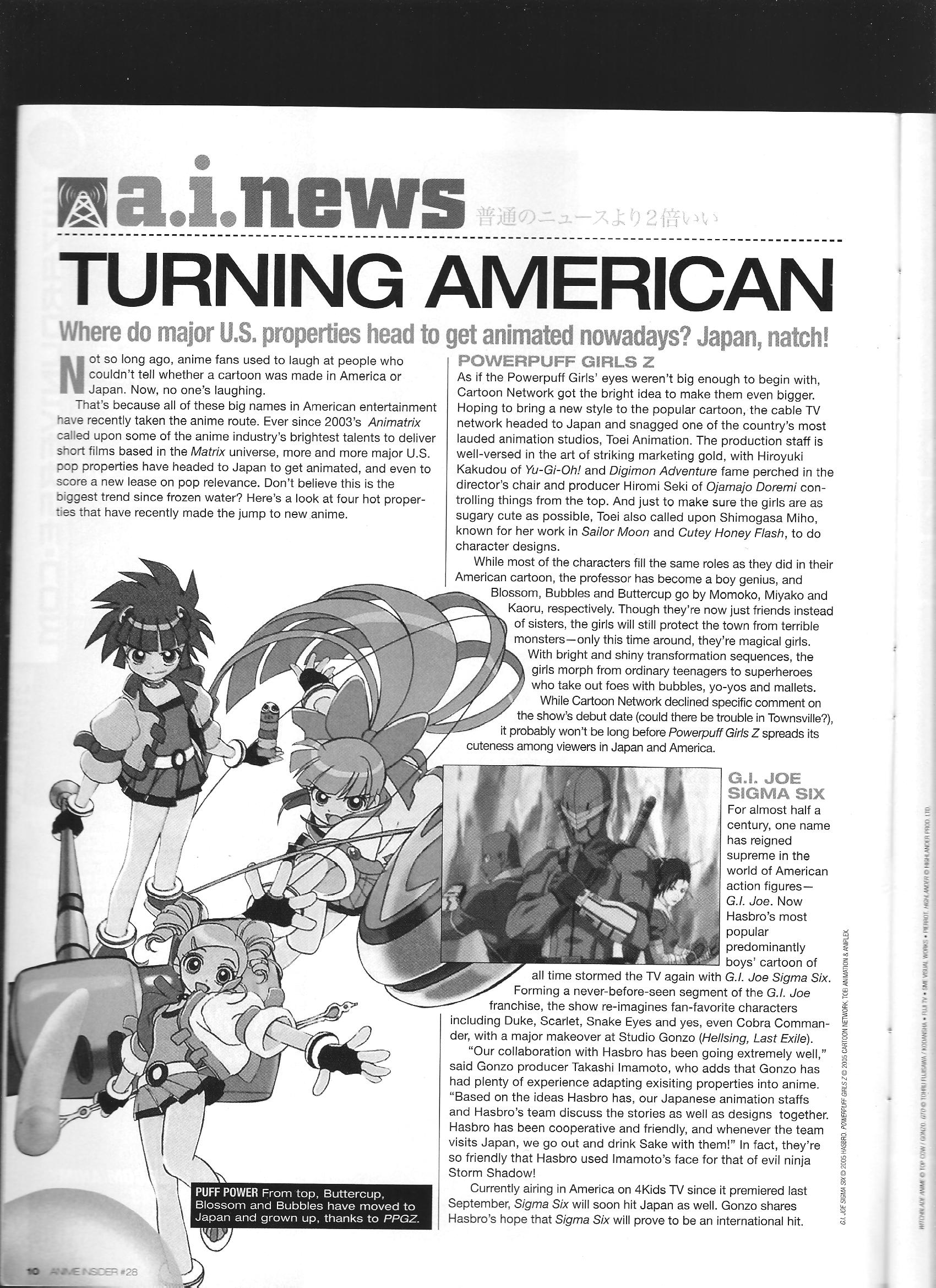 Via Anime Insider: US Properties Animated in Japan (January 2006) Posted on July 15, 2014 by torisunanohokori An article about various US properties that got shows made by Japanese studios. Share this: Click to share on X (Opens in new window) X Click to share on Facebook (Opens in new window) Facebook Like Loading...