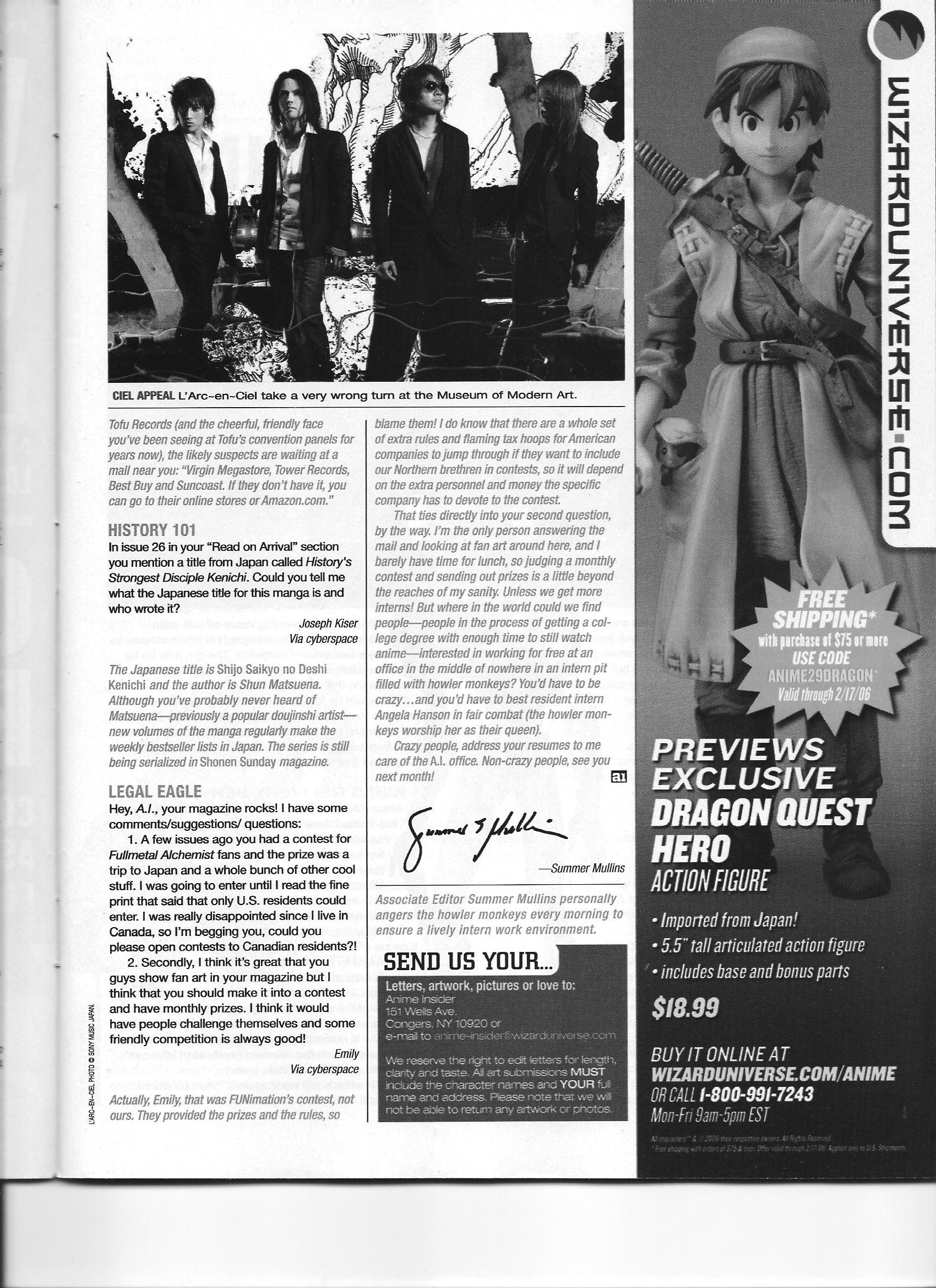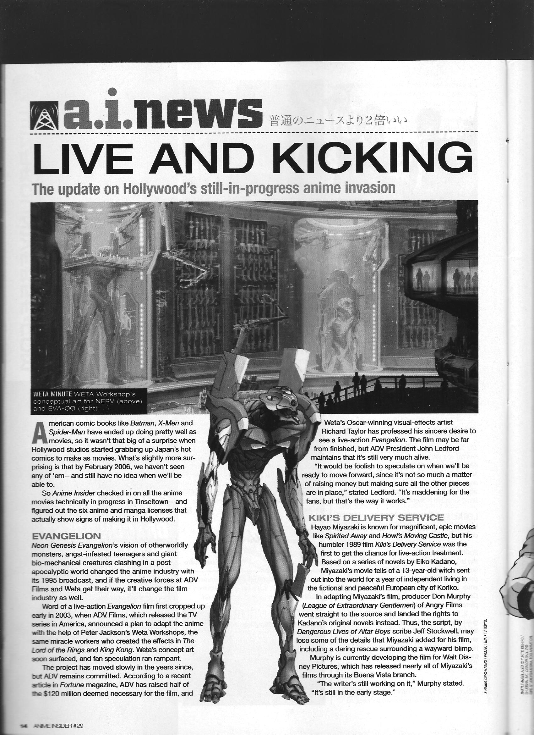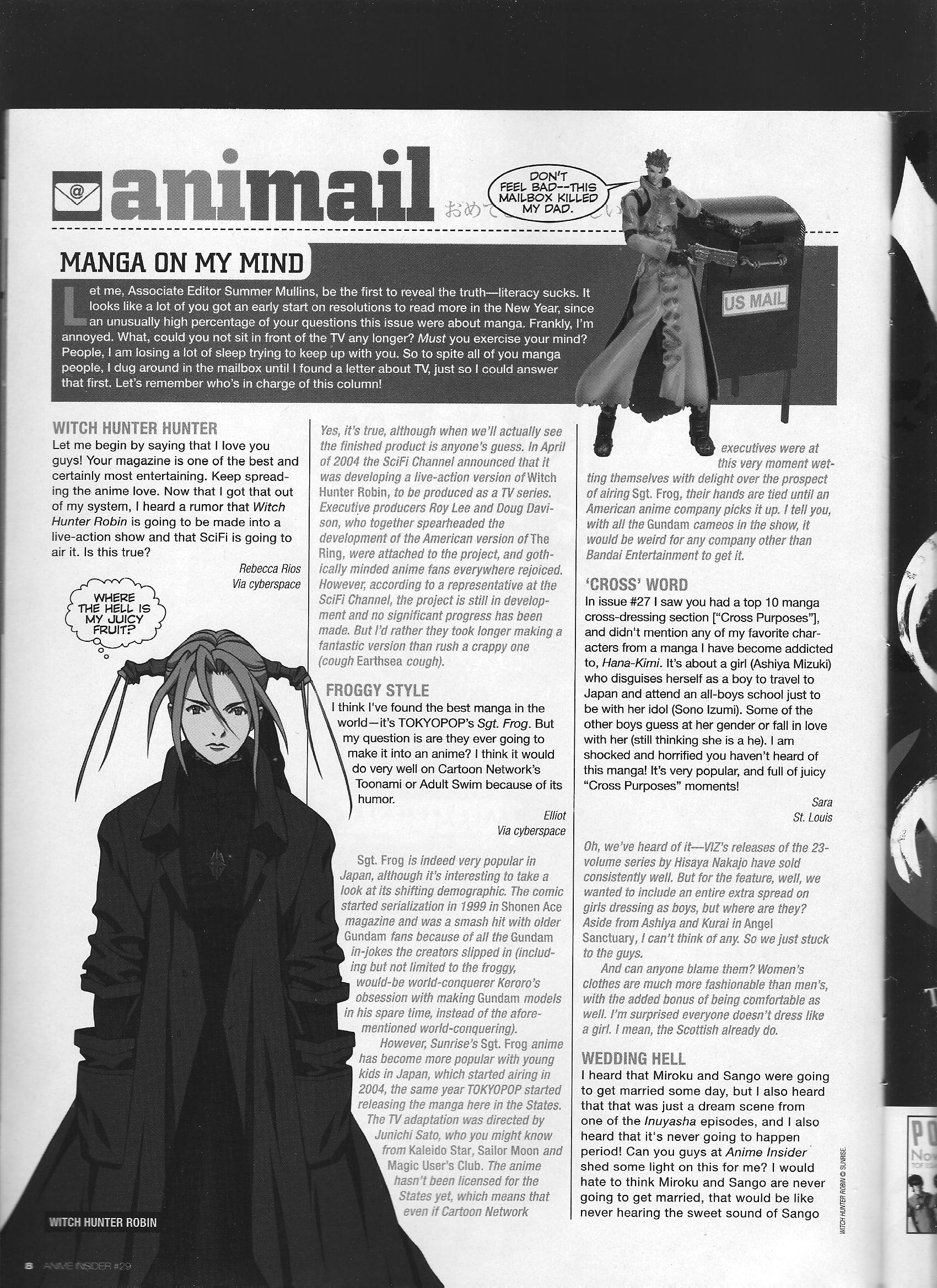 Via Anime Insider: Live-Action Adaptations (February 2006) Posted on July 17, 2014 by torisunanohokori 2 bits from the same issue: one 2-page article regarding the status of various anime/live-action adaptations, and a reader mail segment mentioning a SciFi Channel live-action project for Witch Hunter Robin. — Share this: Click to share on X (Opens in new window) X Click to share on Facebook (Opens in new window) Facebook Like Loading...