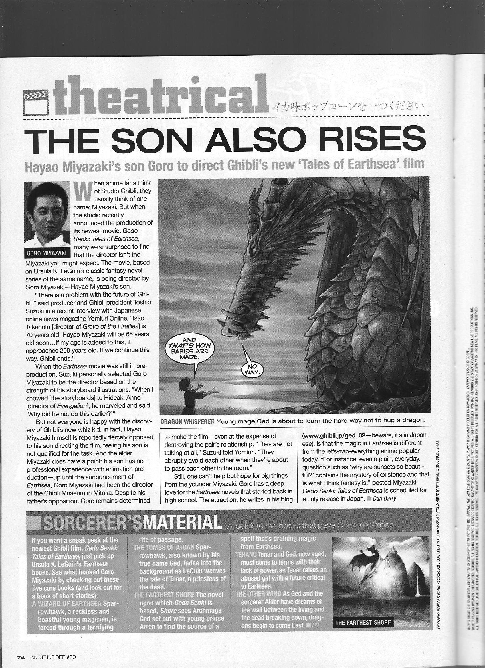 Via Anime Insider: Tales of Earthsea (March 2006) Posted on July 18, 2014 by torisunanohokori A short article on the then-upcoming Tales of Earthsea movie, with some comments on Toshio Suzuki’s awareness of the need to develop new talent before the elder Miyazaki’s retirement. Share this: Click to share on X (Opens in new window) X Click to share on Facebook (Opens in new window) Facebook Like Loading...
