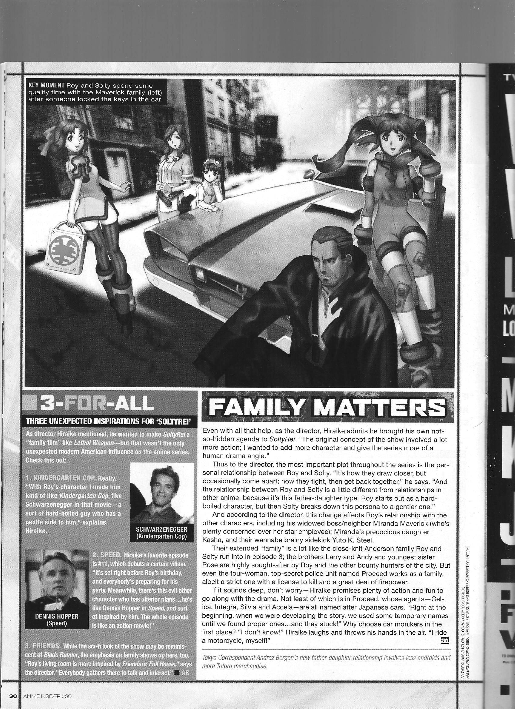 Director Yoshimasa Hiraike talks about the core releationships that drove Solty Rei, along with the numerous works that influenced it (Lethal Weapon, Kindergarten Cop, Speed, and, surprisingly, Friends).