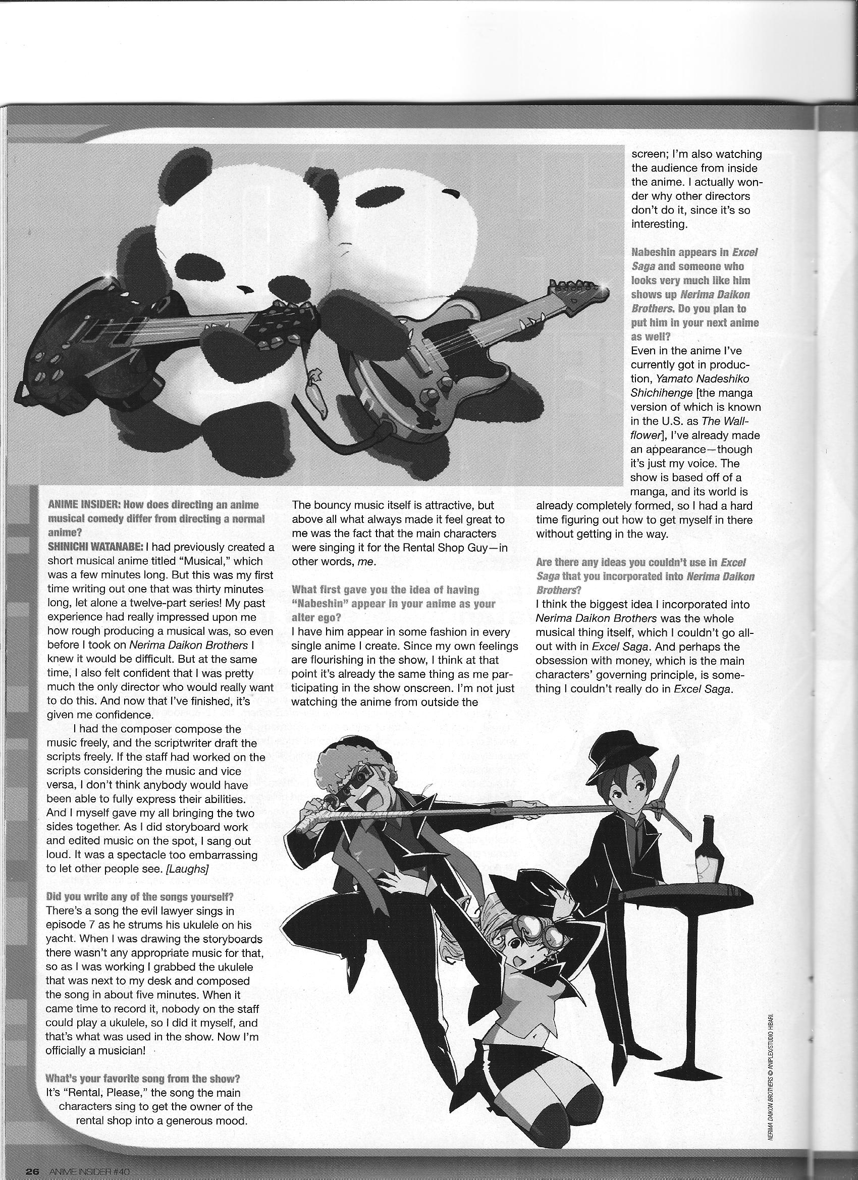 Via Anime Insider: Nabeshin (January 2007) Posted on August 6, 2014 by torisunanohokori An interview with director Nabeshin, of Excel Saga fame, on Nerima Daikon Brothers. Share this: Click to share on X (Opens in new window) X Click to share on Facebook (Opens in new window) Facebook Like Loading...
