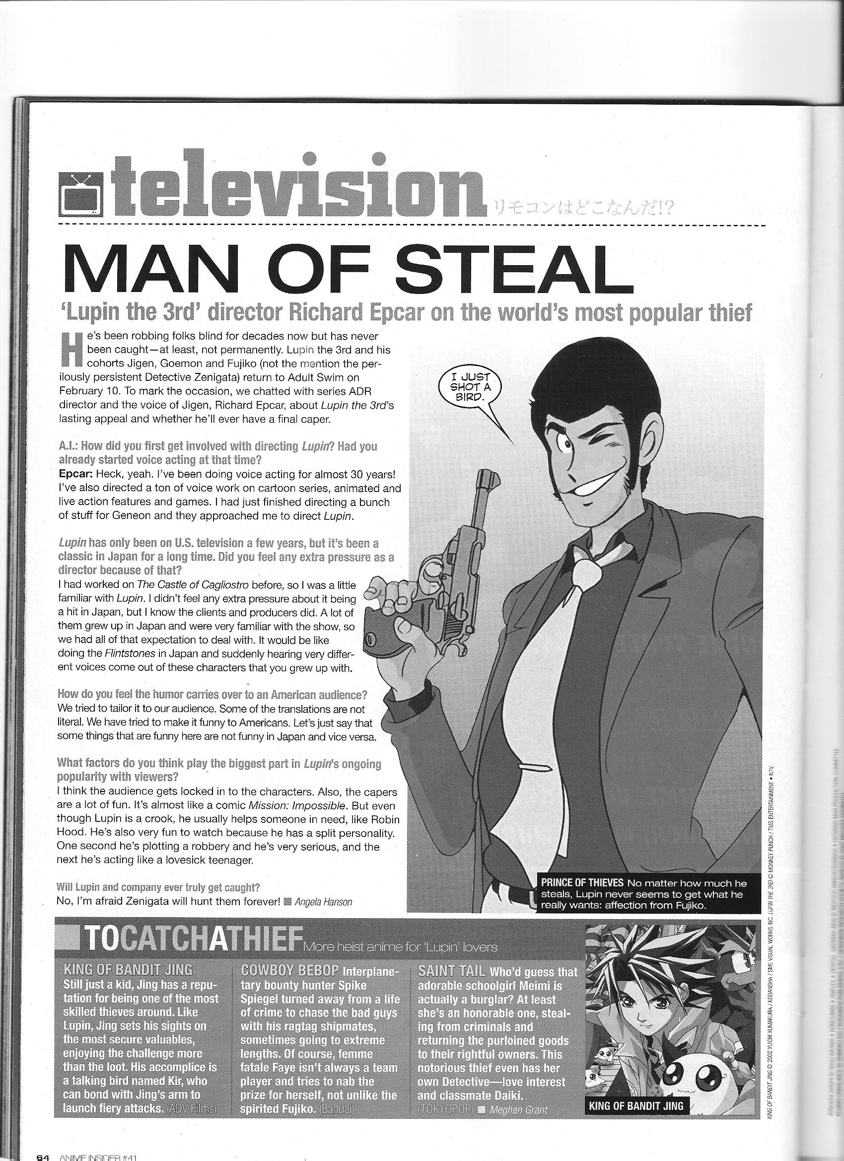 Via Anime Insider: Richard Epcar (February 2007) Posted on August 11, 2014 by torisunanohokori Short interview with Richard Epcar, English voice of Jigen Daisuke and ADR director of the localization. Share this: Click to share on X (Opens in new window) X Click to share on Facebook (Opens in new window) Facebook Like Loading...