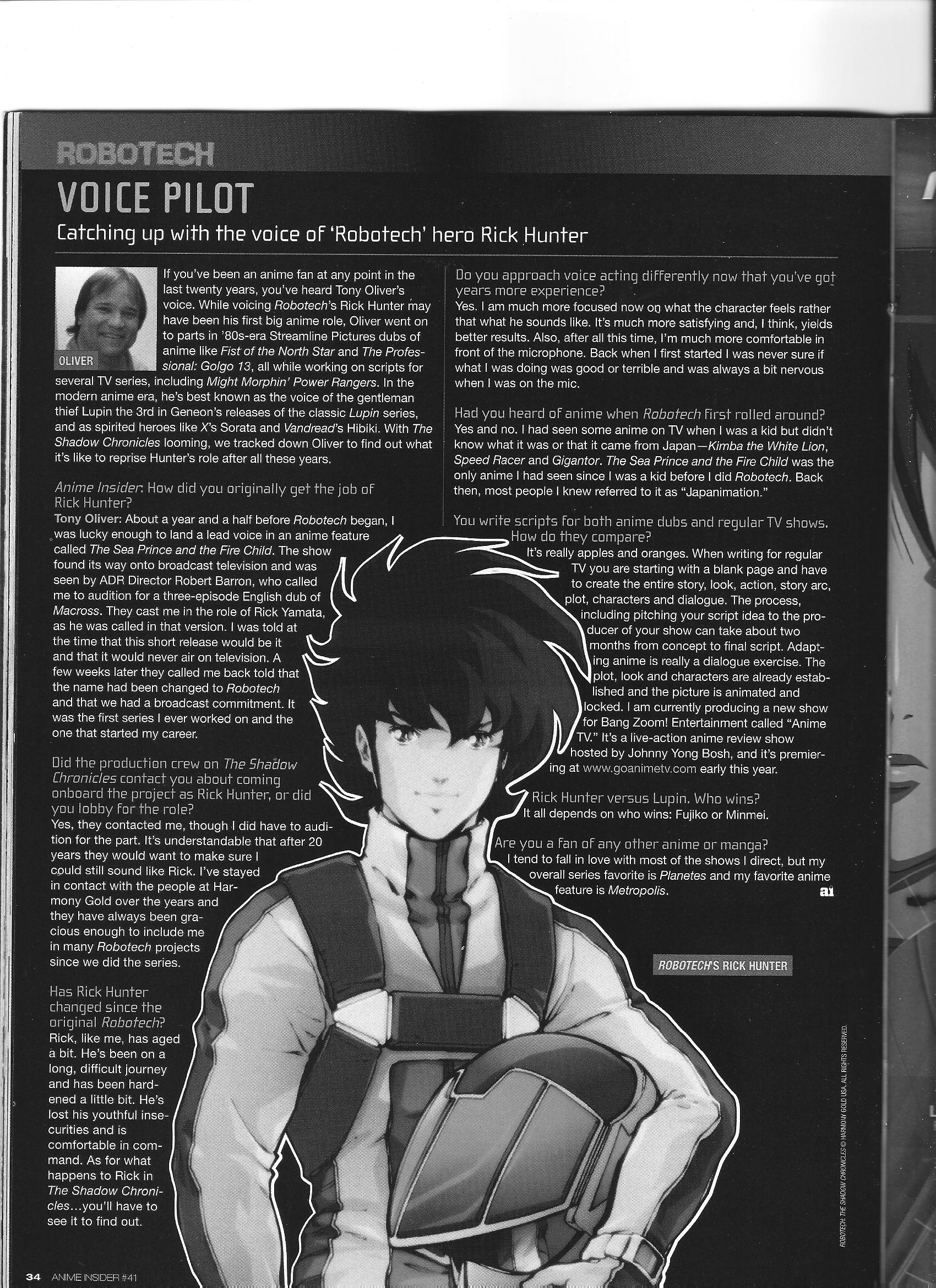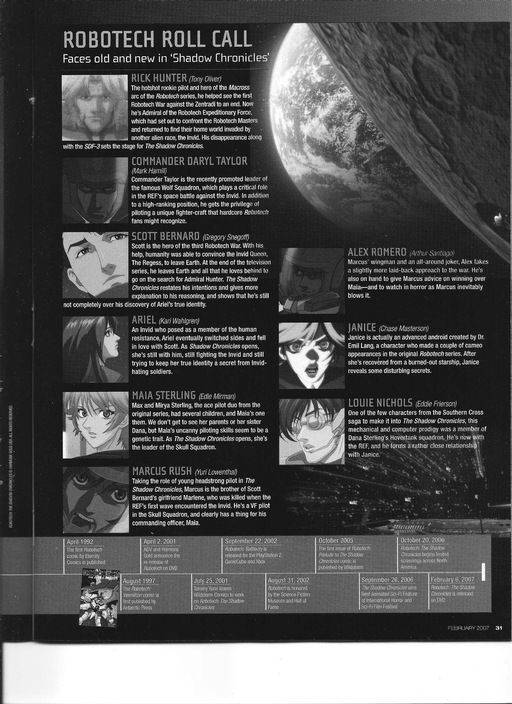 Via Anime Insider: Robotech – The Shadow Chronicles (February 2007) Posted on August 11, 2014 by torisunanohokori An article covering various aspects of the Robotech sequel, including interviews with director Tommy Yune and VA Tony Oliver. Share this: Click to share on X (Opens in new window) X Click to share on Facebook (Opens in new window) Facebook Like Loading...
