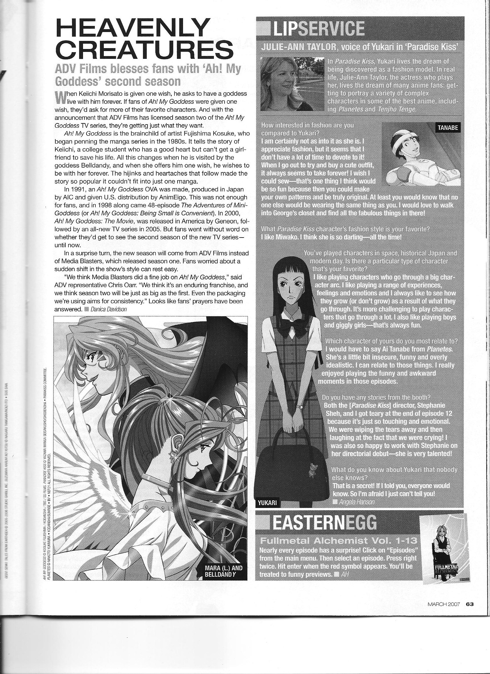 Via Anime Insider: Julie-Ann Taylor (March 2007) Posted on August 12, 2014 by torisunanohokori A short interview with English VA Julie Ann-Taylor. Share this: Click to share on X (Opens in new window) X Click to share on Facebook (Opens in new window) Facebook Like Loading...