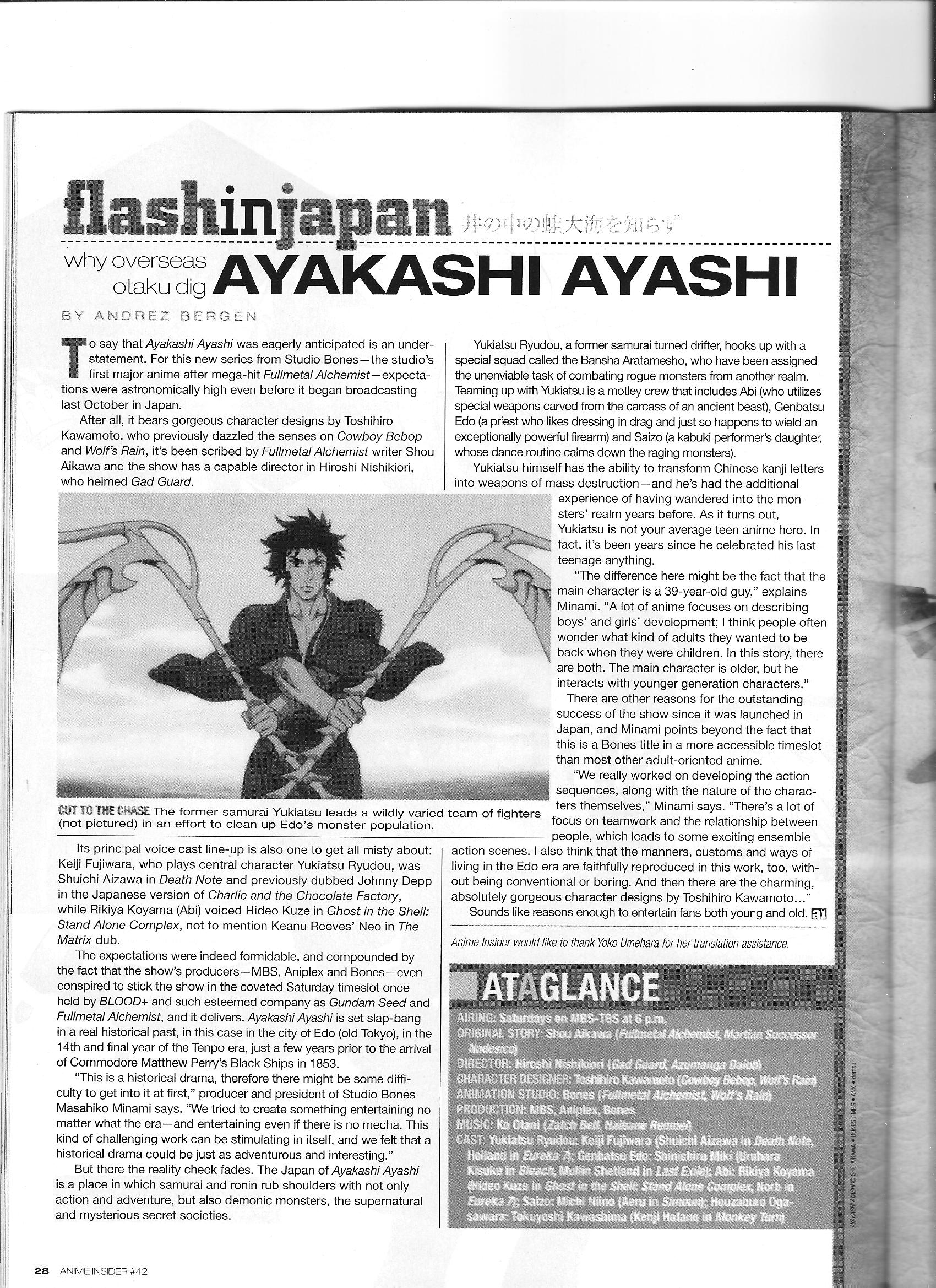 Via Anime Insider: Masahiko Minami (March 2007) Posted on August 12, 2014 by torisunanohokori Bones Prez Masahiko Minami discusses elements of Ayakashi Ayashi. Share this: Click to share on X (Opens in new window) X Click to share on Facebook (Opens in new window) Facebook Like Loading...