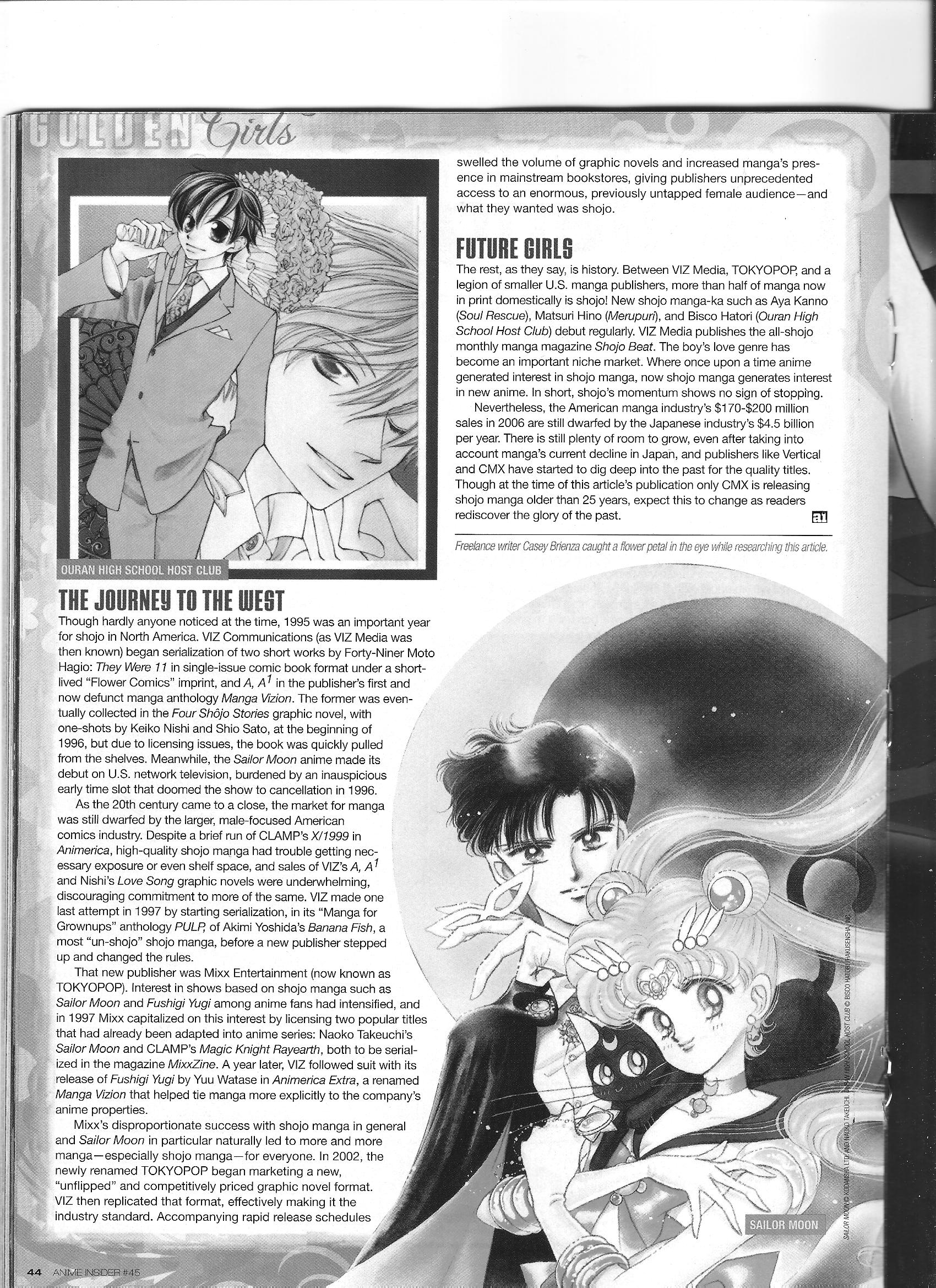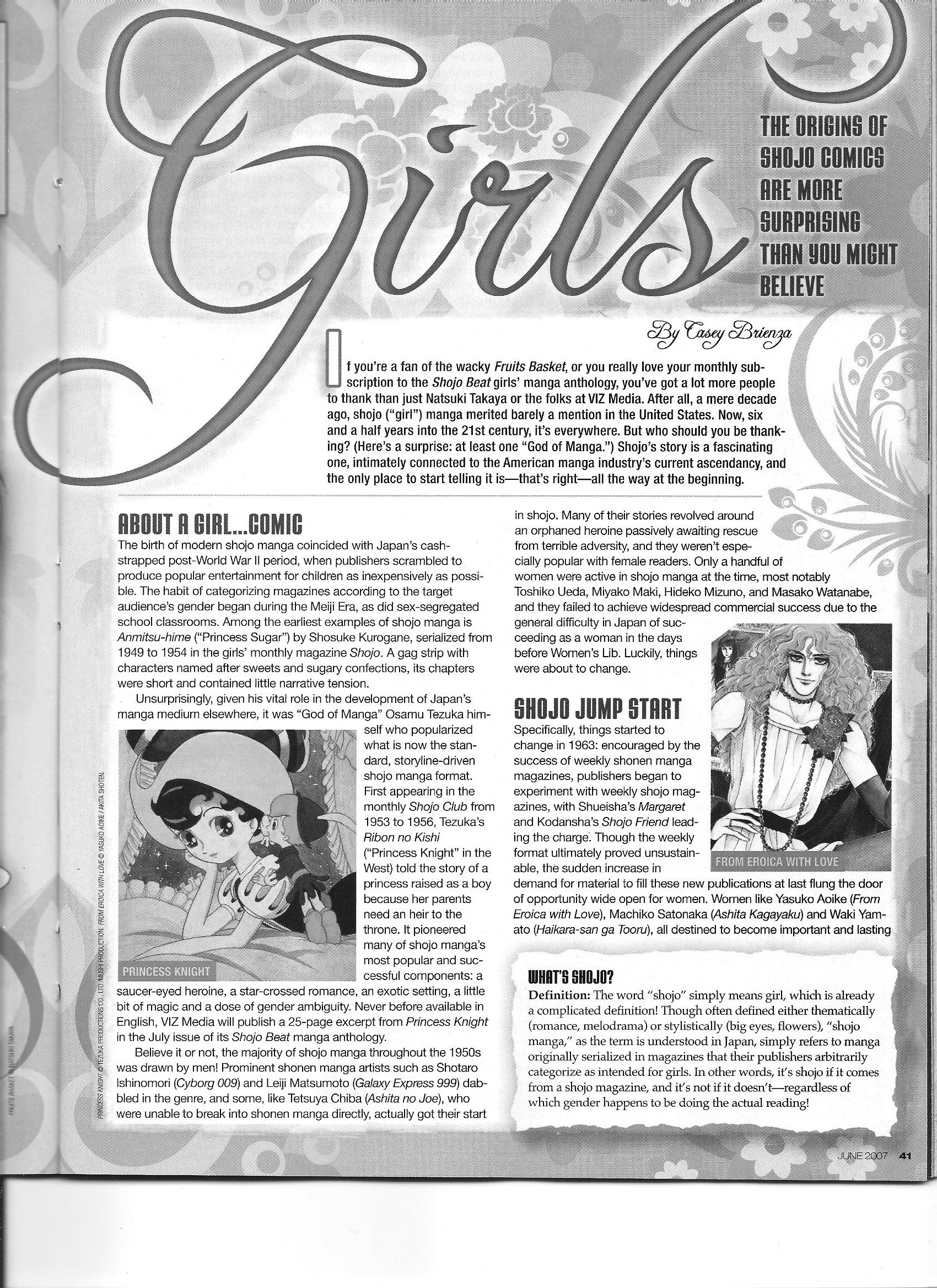 Via Anime Insider: Shojo History (June 2007) Posted on August 21, 2014 by torisunanohokori An article on the history of shojo-demographic manga. Share this: Click to share on X (Opens in new window) X Click to share on Facebook (Opens in new window) Facebook Like Loading...