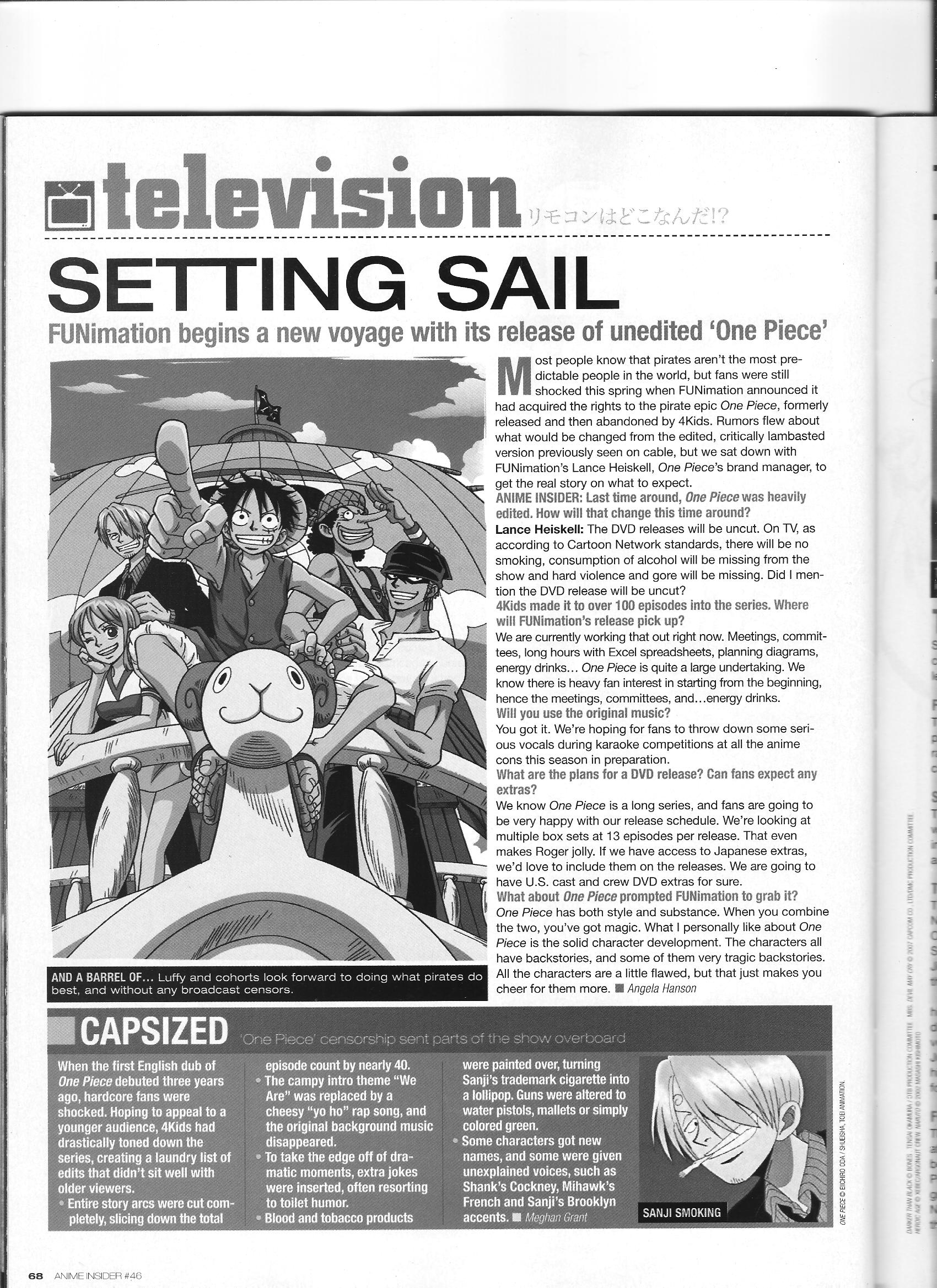Via Anime Insider: Lance Heiskell (July 2007) Posted on September 19, 2014 by torisunanohokori Funimation’s One Piece brand manager Lance Heiskell talks briefly about their plans to rerelease the series. Share this: Click to share on X (Opens in new window) X Click to share on Facebook (Opens in new window) Facebook Like Loading...