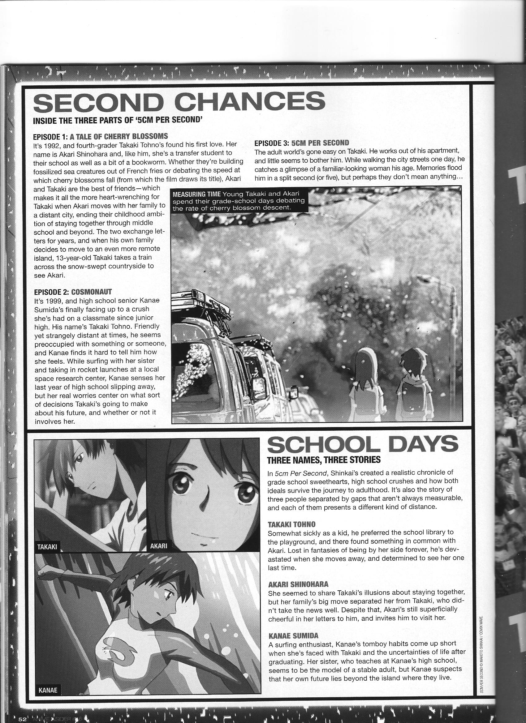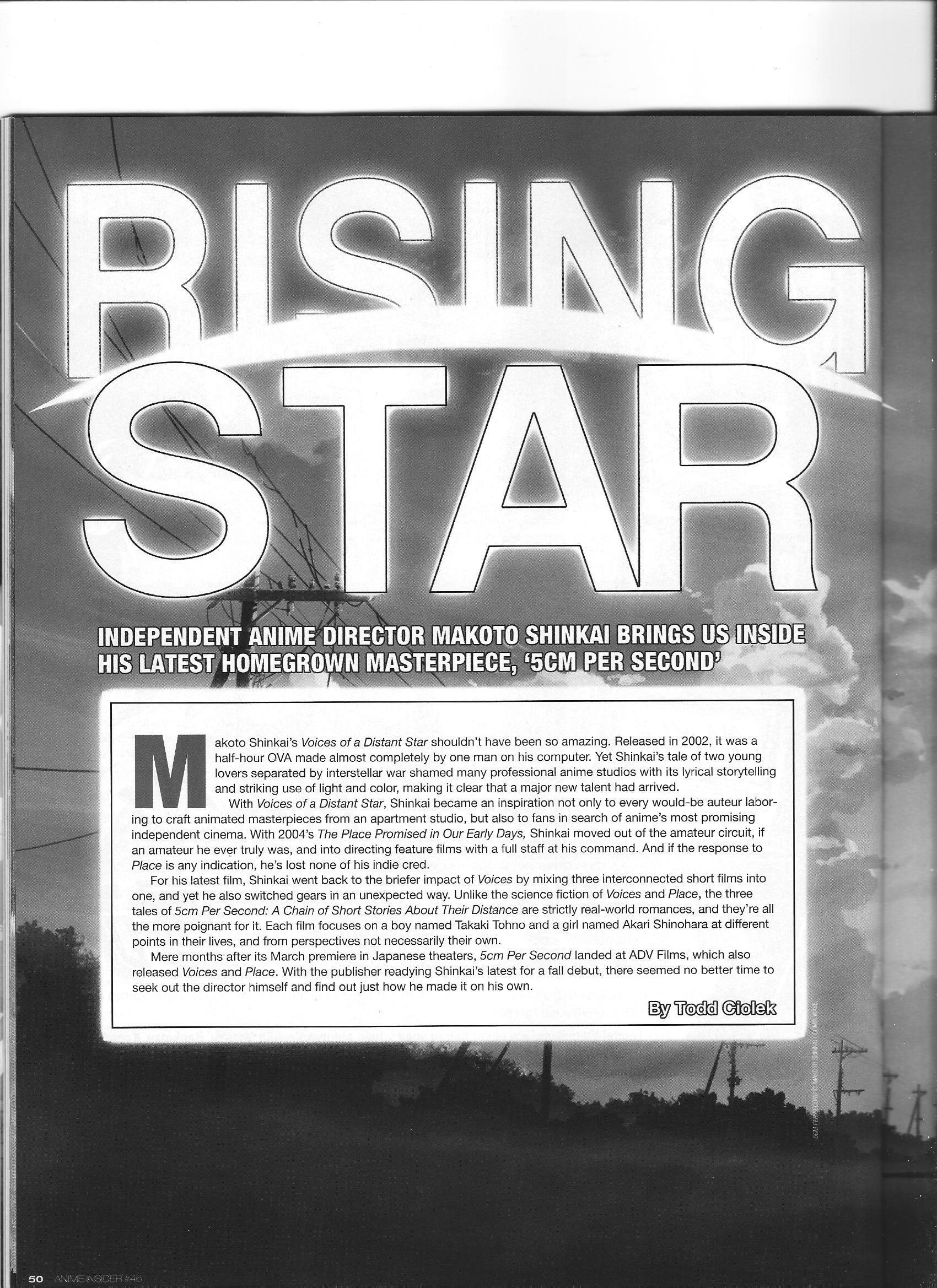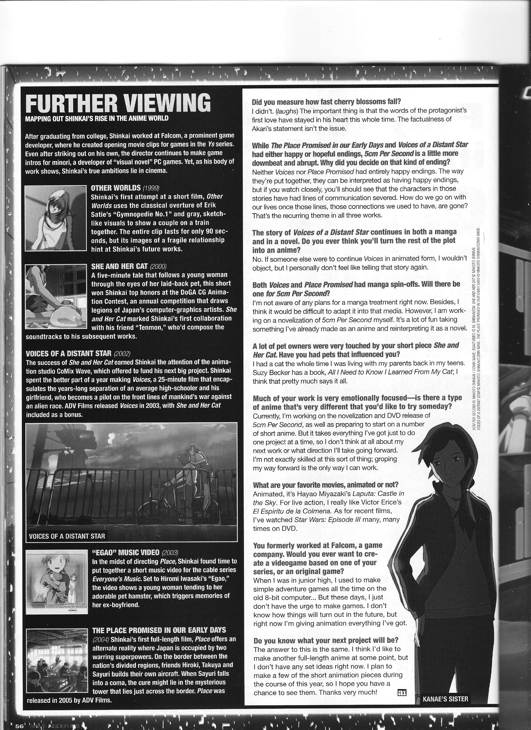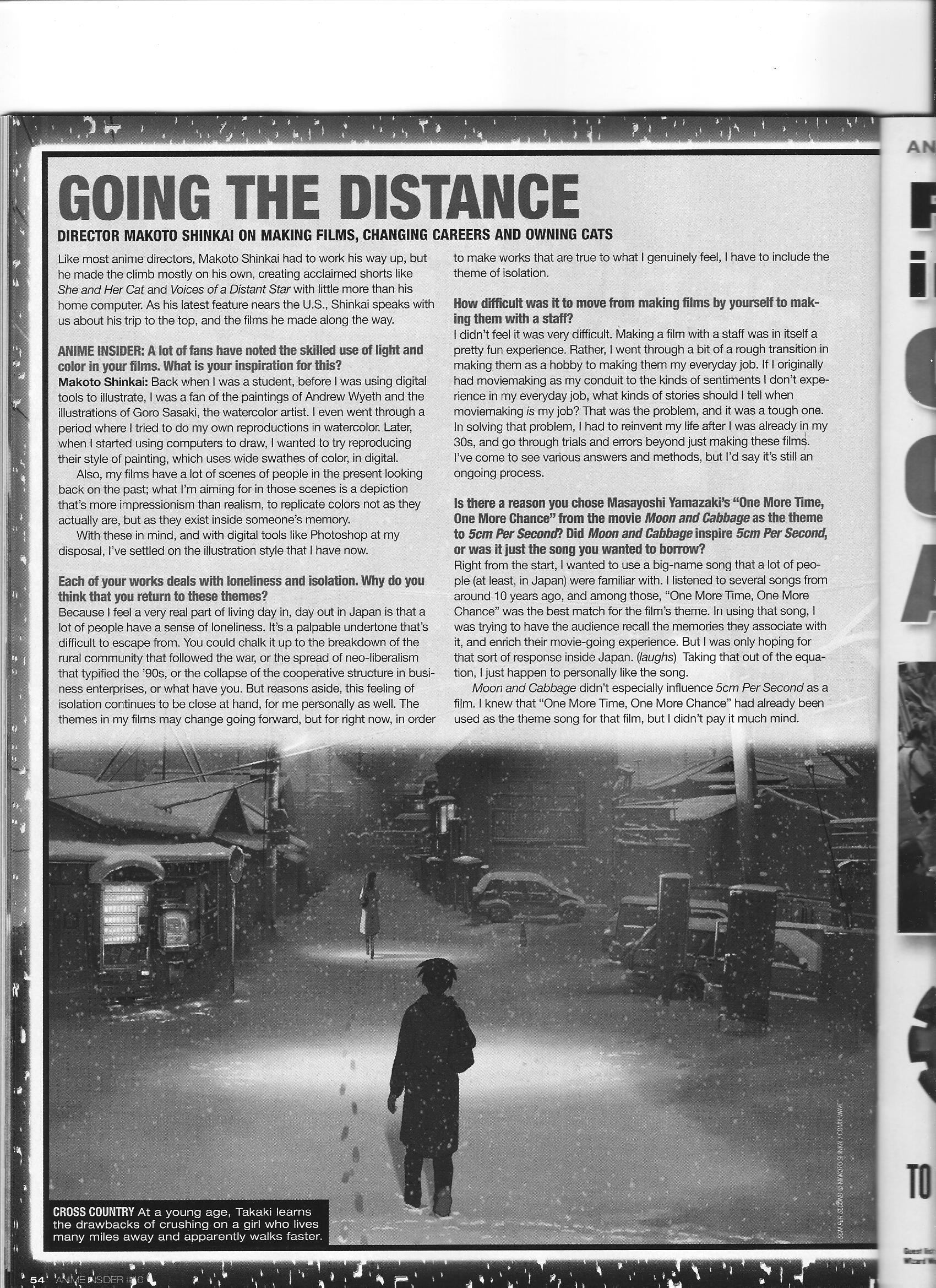 Makoto Shinkai talks about a bunch of stuff, including being inspired by the styles of Andrew Wyeth and Goro Sasaki, picking the theme song for 5cm/s, his sense of a bad ending, and his favorite movies.