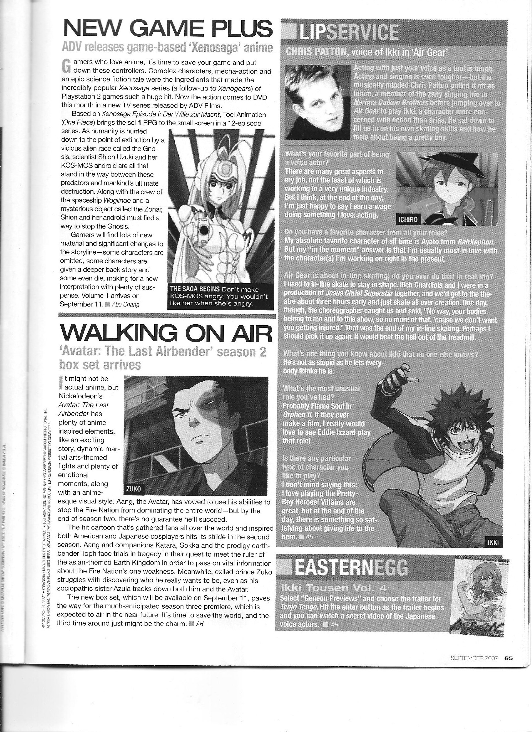 Via Anime Insider: Chris Patton (August 2007) Posted on September 27, 2014 by torisunanohokori A short interview with NA voice actor Chris Patton. Share this: Click to share on X (Opens in new window) X Click to share on Facebook (Opens in new window) Facebook Like Loading...