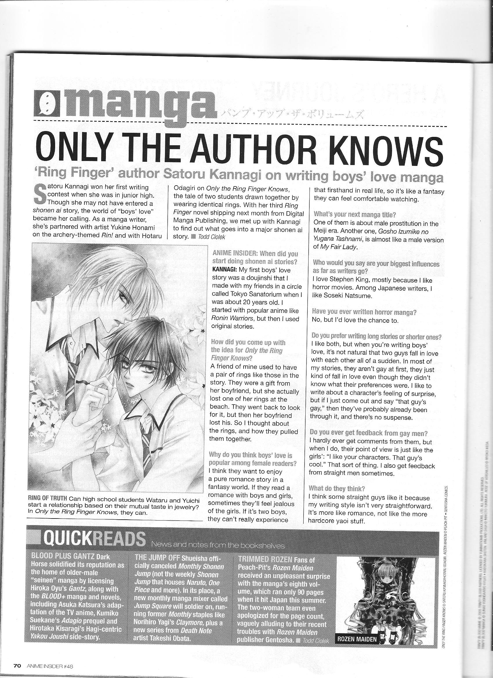 Via Anime Insider: Satoru Kannagi (August 2007) Posted on September 27, 2014 by torisunanohokori BL manga writer Satoru Kannagi talks about her favorite authors and getting feedback from male readers. Share this: Click to share on X (Opens in new window) X Click to share on Facebook (Opens in new window) Facebook Like Loading...
