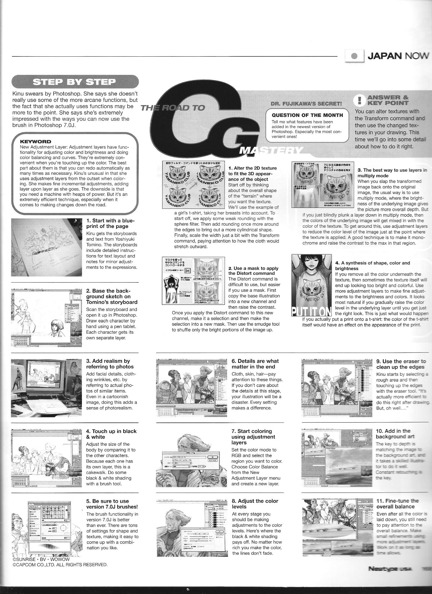 Via Newtype USA: How to Art – Kinu Nishimura (January 2003) Posted on November 22, 2014 by torisunanohokori Artist Kinu Nishimura shares details of how she creates an image. This is part of a recurring back-of-magazine feature that I missed when scanning other issues, so I’ll probably be uploading those, either individually or as a batch, at some point. Share this: Click to share on X (Opens in new window) X Click to share on Facebook (Opens in new window) Facebook Like Loading...