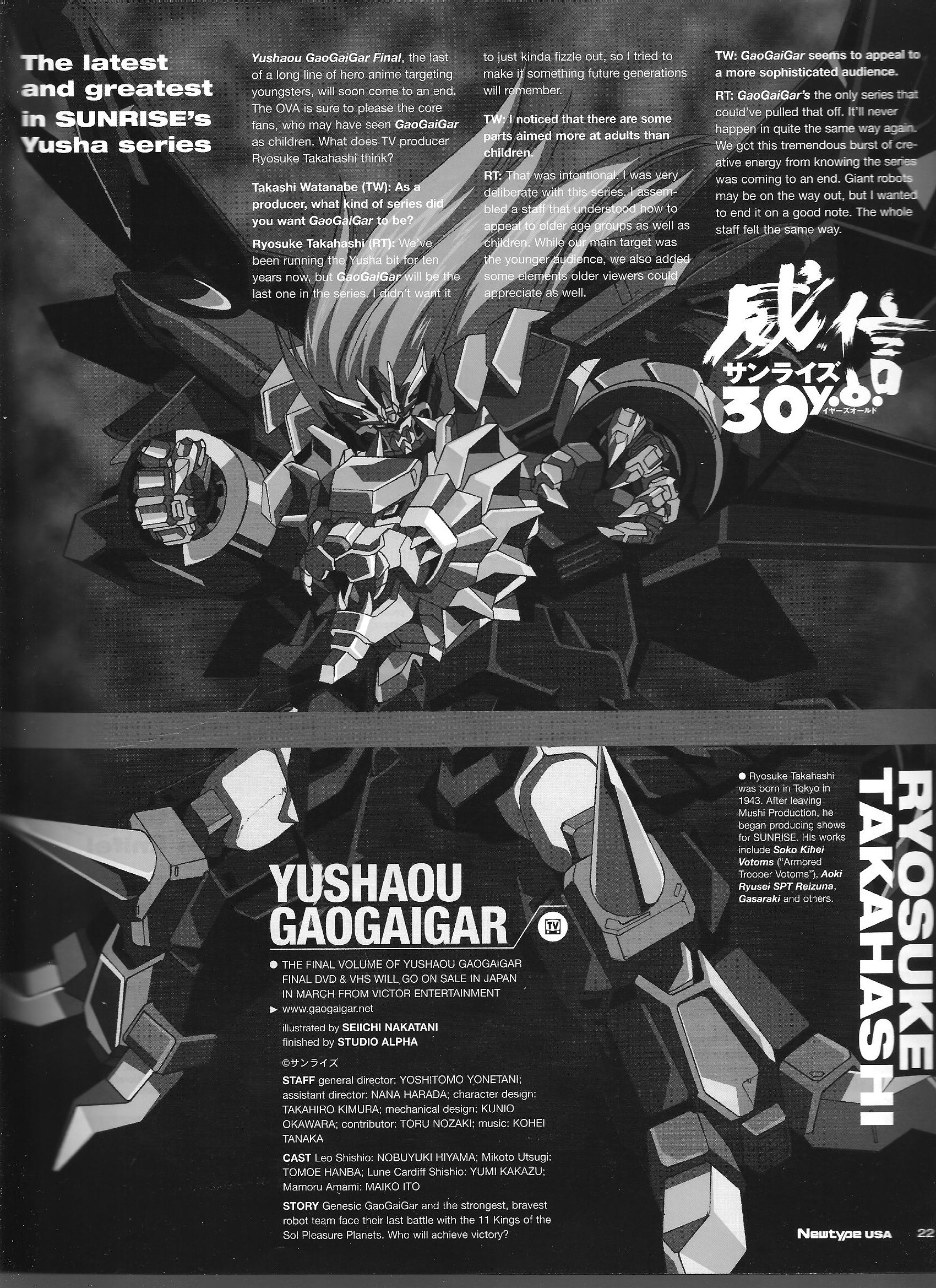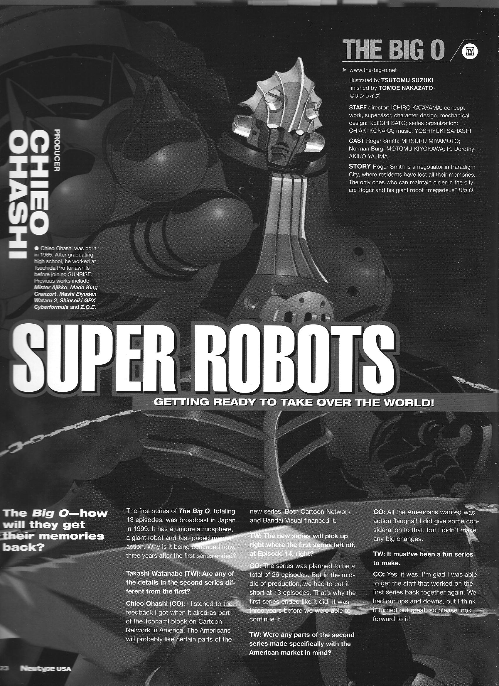 Via Newtype USA: Ryosuke Takahashi and Chieo Ohashi (January 2003) Posted on November 22, 2014 by torisunanohokori Gaogaigar producer Ryosuke Takahashi and Big O producer Chieo Ohashi talk about their respective robot projects. Share this: Click to share on X (Opens in new window) X Click to share on Facebook (Opens in new window) Facebook Like Loading...