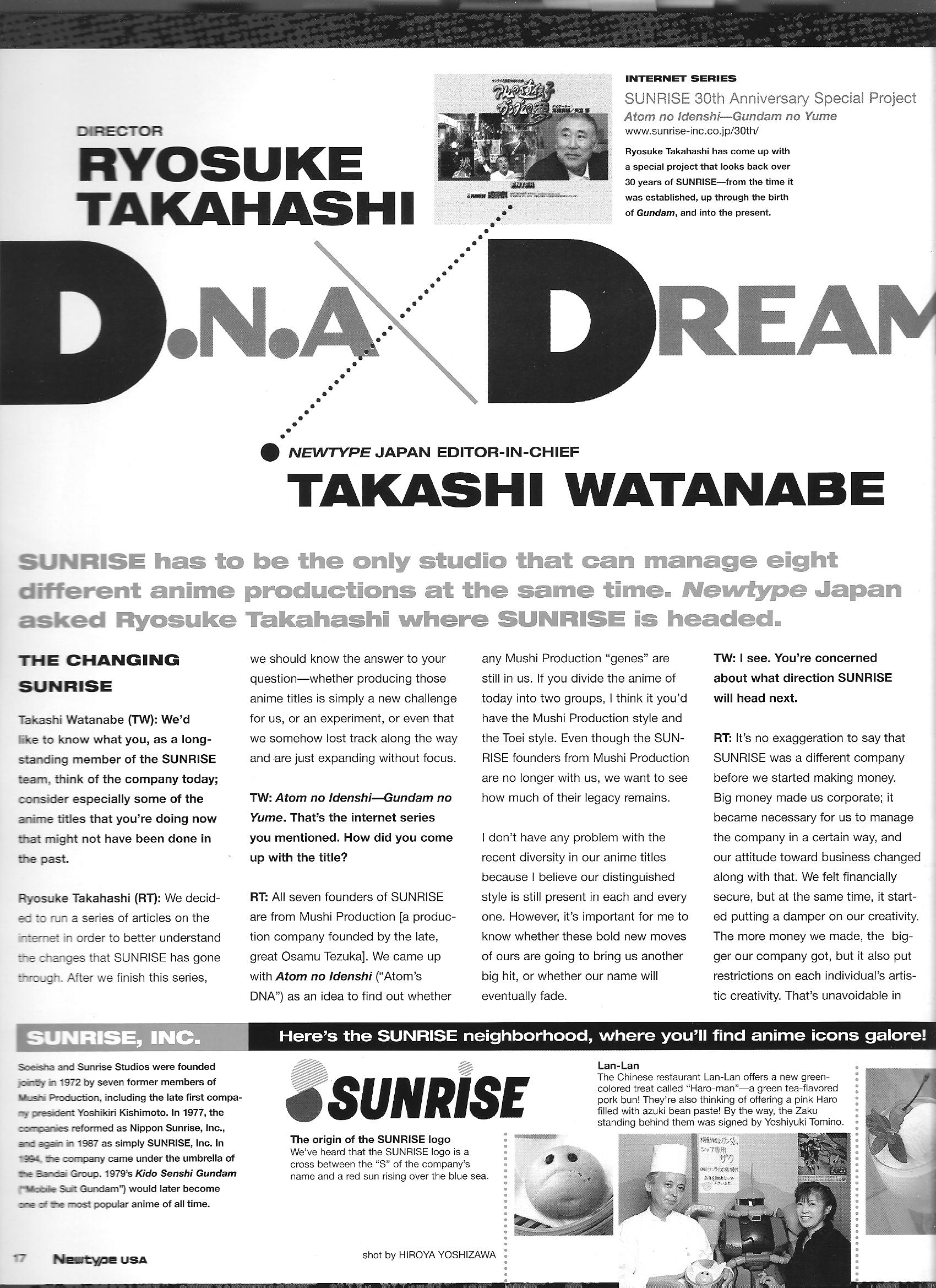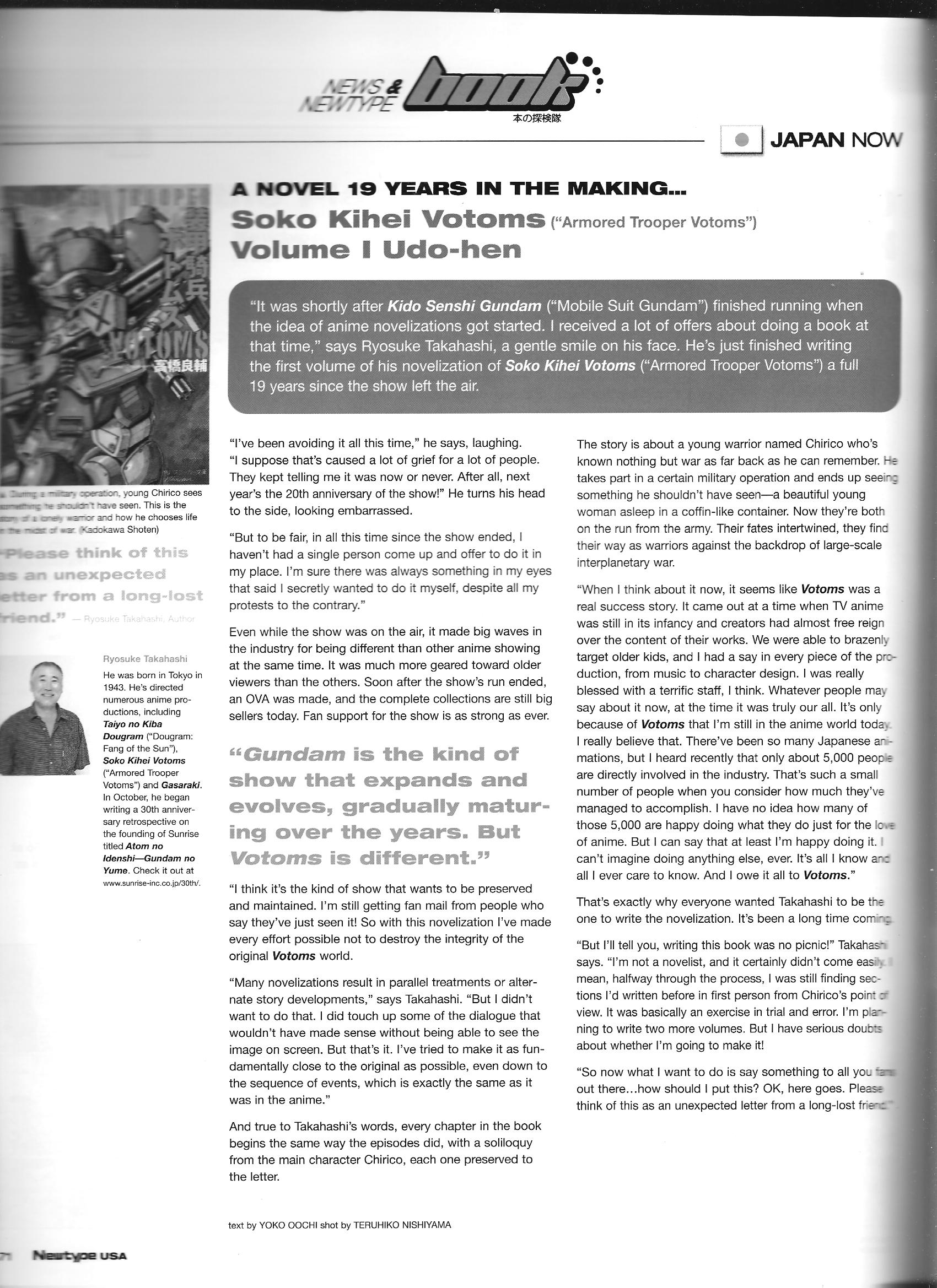 Via Newtype USA: Ryosuke Takahashi (January 2003) Posted on November 22, 2014 by torisunanohokori A pair of articles in which Ryosuke Takahashi talks about his production duties, the future of Sunrise (including worries about corporate culture and a lack of “good pressure” on creators), and an Armored Trooper Votoms novel. — Share this: Click to share on X (Opens in new window) X Click to share on Facebook (Opens in new window) Facebook Like Loading...
