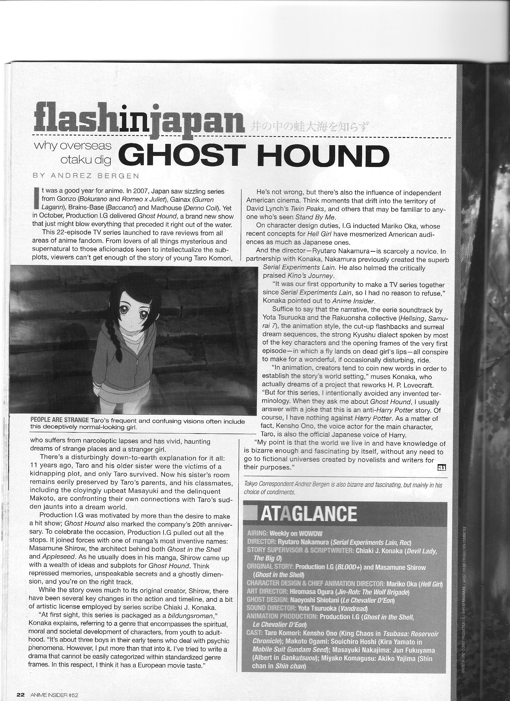 Via Anime Insider: Chiaki Konaka (January 2008) Posted on December 13, 2014 by torisunanohokori A short article on Ghost Hound including quotes from writer Chiaki Konaka, who talks about working with the late, great Ryutaro Nakamura and avoiding getting bogged down in terminology. Share this: Click to share on X (Opens in new window) X Click to share on Facebook (Opens in new window) Facebook Like Loading...