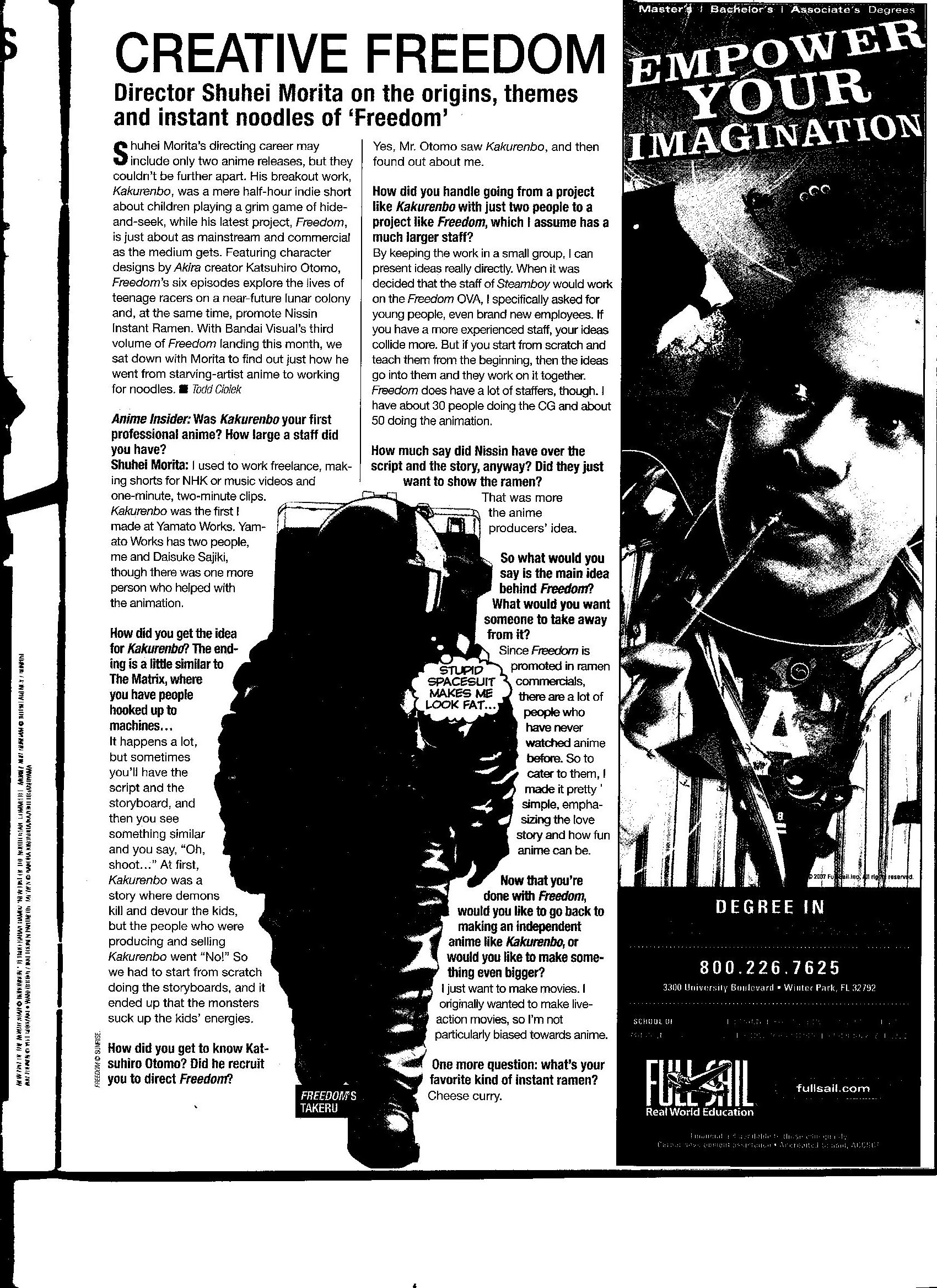 Via Anime Insider: Shuhei Morita (December 2007) Posted on December 13, 2014 by torisunanohokori Director Shuhei Morita talks about working on Kakurenbo with an extremely small staff, specifically assembling a young staff for Freedom, and catering to his “ramen commercial” audience. Share this: Click to share on X (Opens in new window) X Click to share on Facebook (Opens in new window) Facebook Like Loading...