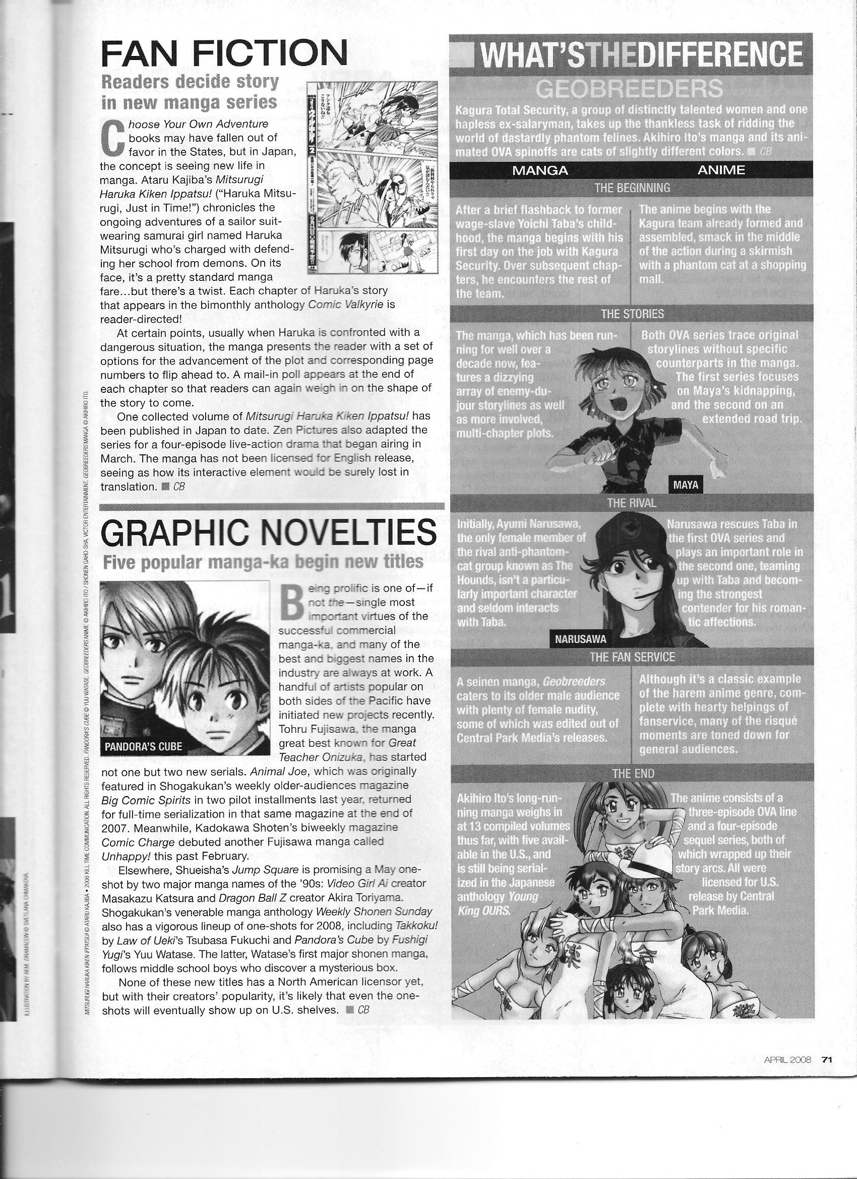 Via Anime Insider: Readers’ Choice Manga Plots (April 2008) Posted on January 2, 2015 by torisunanohokori Interesting short article about a manga (Mitsurugi Haruka Kiken Ippatsu) wherein the next plot development was determined by bimonthly reader polling. Share this: Click to share on X (Opens in new window) X Click to share on Facebook (Opens in new window) Facebook Like Loading...