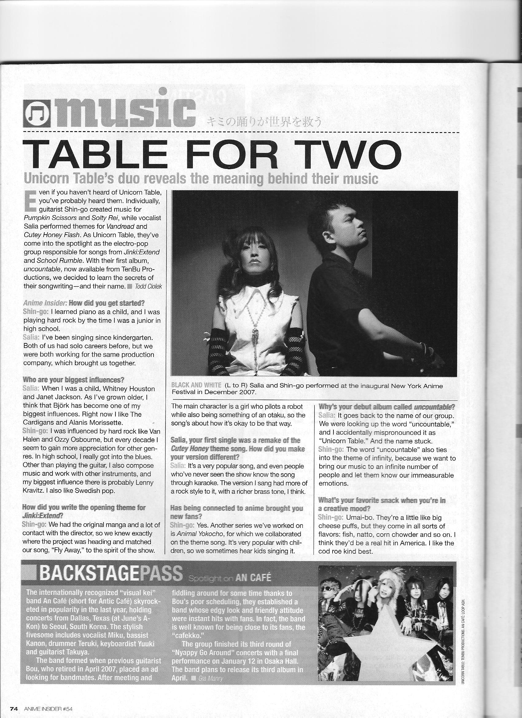 Via Anime Insider: Unicorn Table (March 2008) Posted on January 2, 2015 by torisunanohokori A short interview with Japanese band Unicorn Table where they talk about their work in writing anime theme songs. Share this: Click to share on X (Opens in new window) X Click to share on Facebook (Opens in new window) Facebook Like Loading...