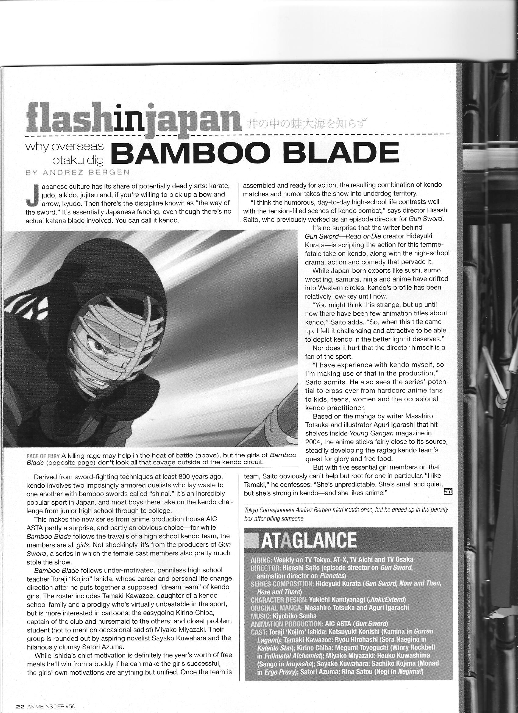 Via Anime Insider: Hisashi Saito (May 2008) Posted on January 3, 2015 by torisunanohokori An interview with Bamboo Blade director Hisashi Saito, who mentions he actually has some personal kendo experience. Share this: Click to share on X (Opens in new window) X Click to share on Facebook (Opens in new window) Facebook Like Loading...