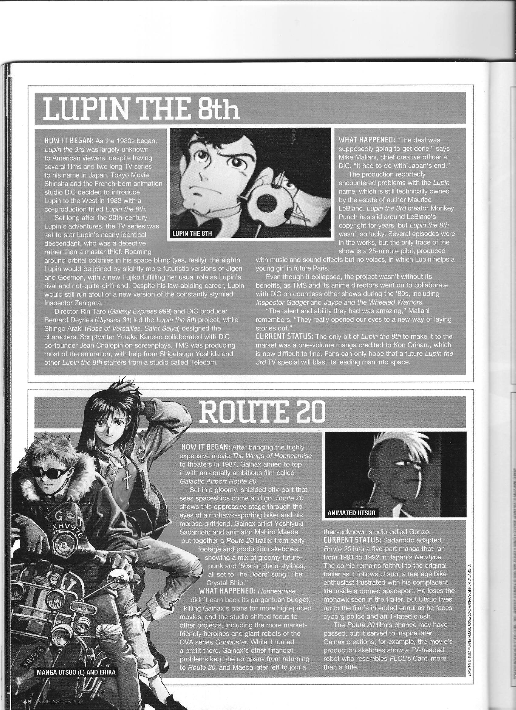 Via Anime Insider: Lost Projects (July 2008) Posted on January 6, 2015 by torisunanohokori A feature on projects that didn’t quite pan out as originally planned, including some cancelled and some heavily modified premises. Share this: Click to share on X (Opens in new window) X Click to share on Facebook (Opens in new window) Facebook Like Loading...