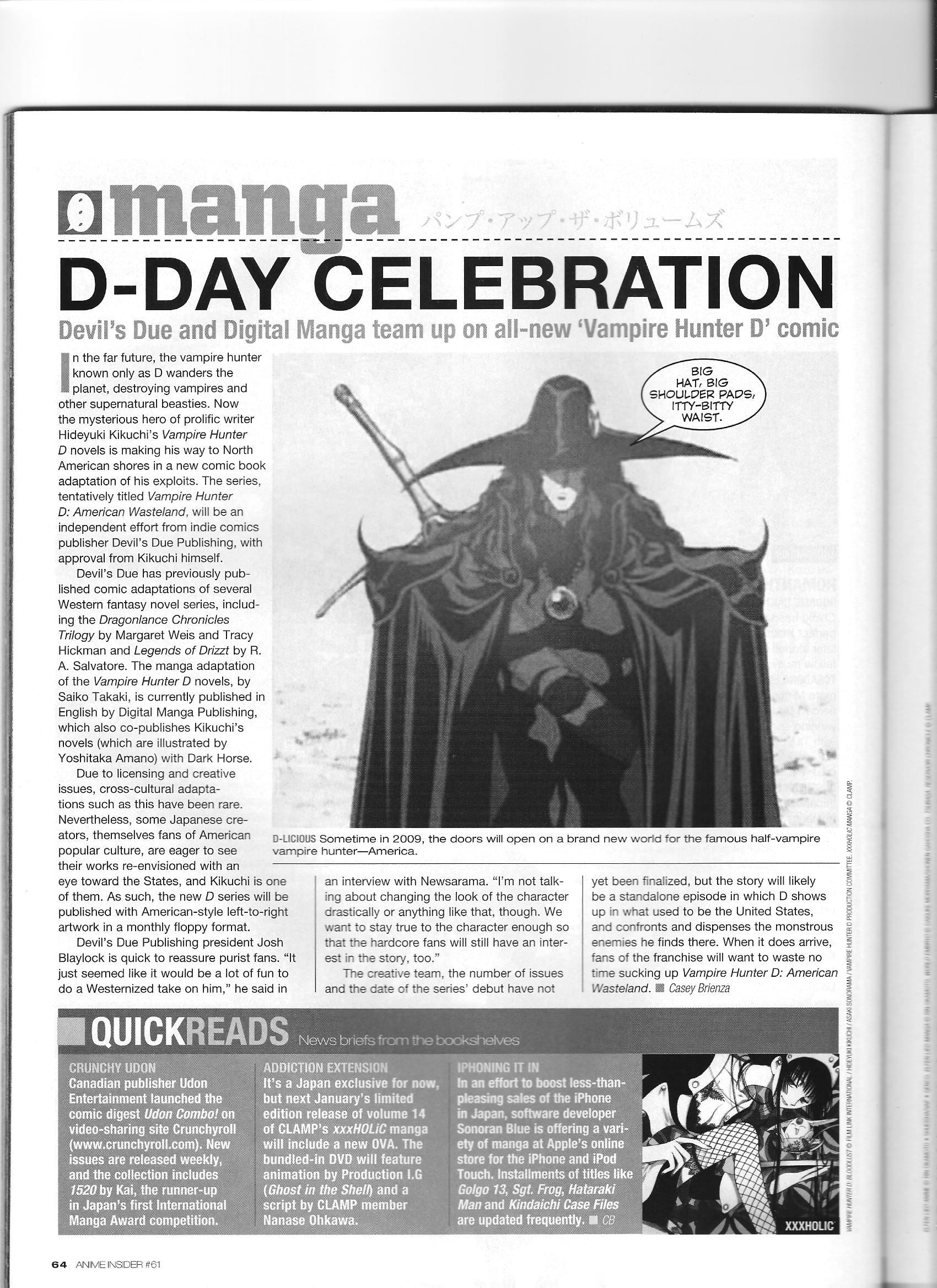 Via Anime Insider: Josh Blaylock (October 2008) Posted on January 10, 2015 by torisunanohokori Devil’s Due Publishing president Josh Blaylock talks about his company’s upcoming Vampire Hunter D reboot. Share this: Click to share on X (Opens in new window) X Click to share on Facebook (Opens in new window) Facebook Like Loading...