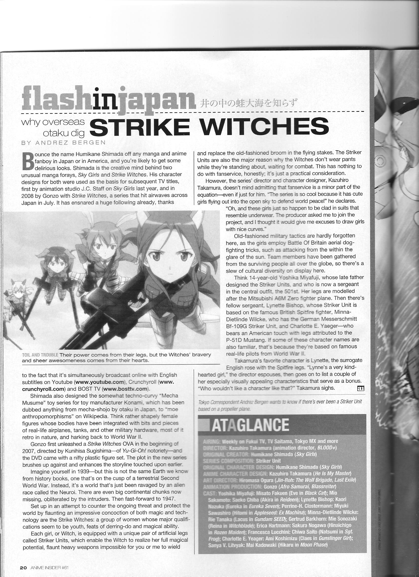 Via Anime Insider: Kazuhiro Takamura (October 2008) Posted on January 10, 2015 by torisunanohokori Director Kazuhiro Takamura talks about Strike Witches, commenting on the designs and his favorite character (Lynette). Share this: Click to share on X (Opens in new window) X Click to share on Facebook (Opens in new window) Facebook Like Loading...