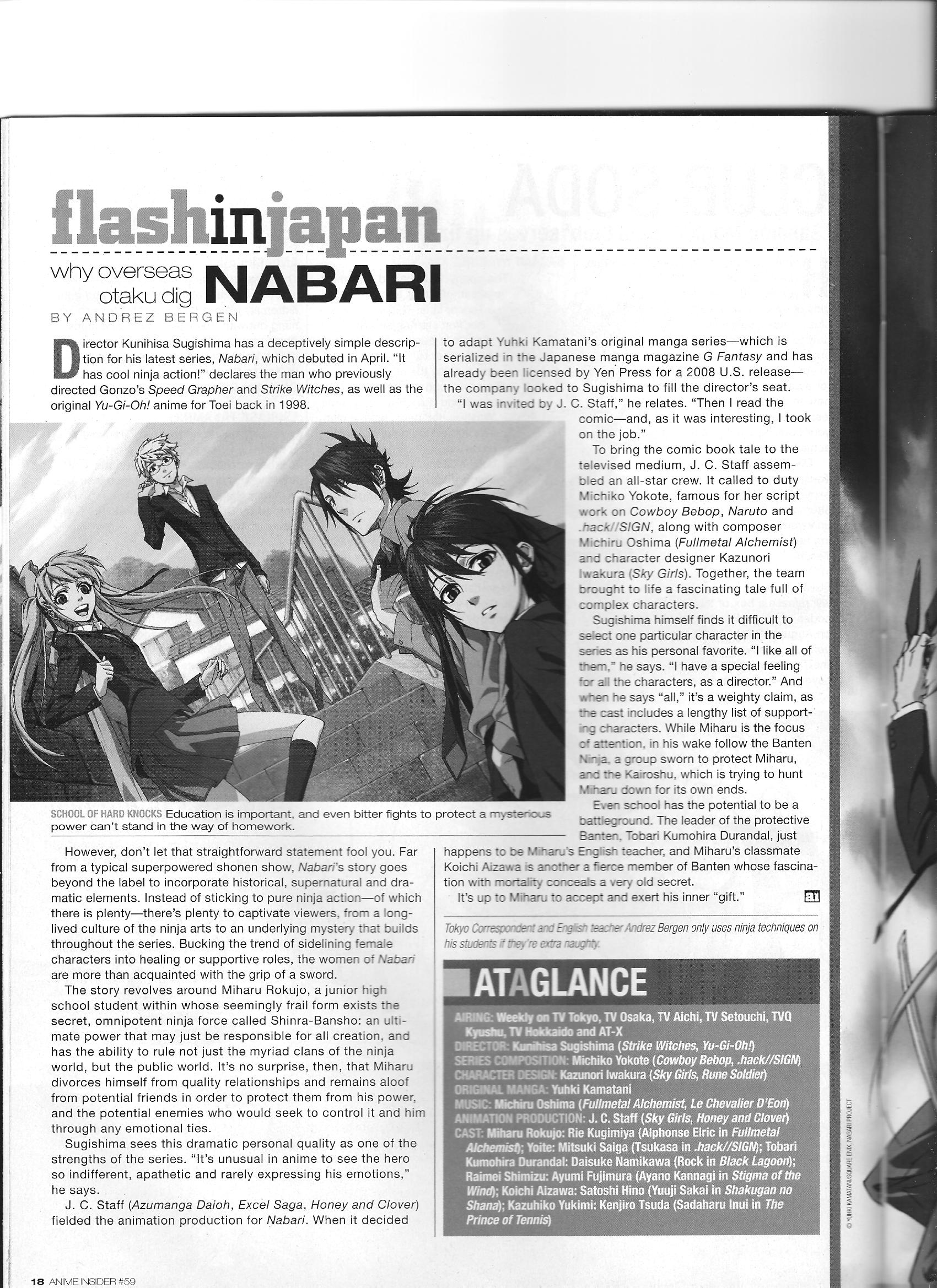 Via Anime Insider: Kunihisa Sugishima (August 2008) Posted on January 10, 2015 by torisunanohokori Director Kunihisa Sugishima talks about Nabari no Ou. Share this: Click to share on X (Opens in new window) X Click to share on Facebook (Opens in new window) Facebook Like Loading...
