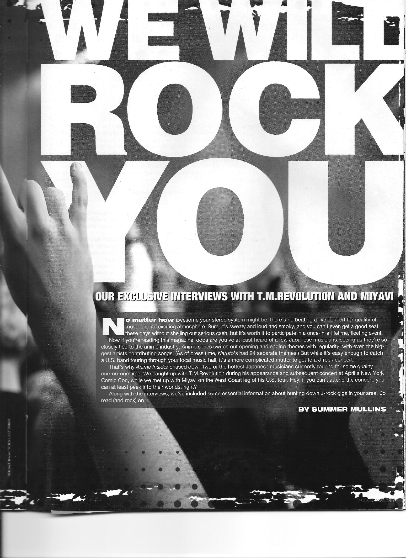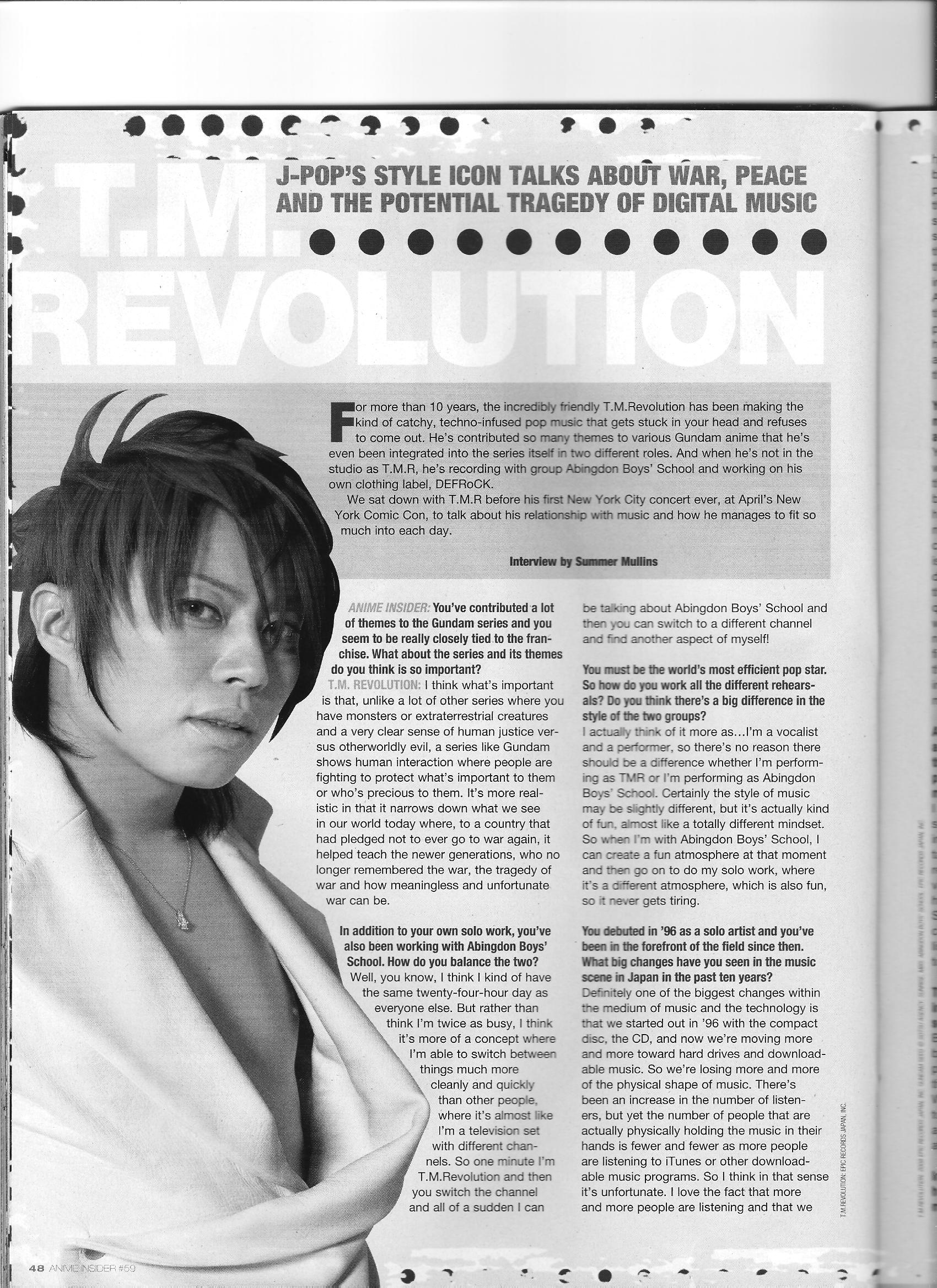 Via Anime Insider: TM Revolution and Miyavi (August 2008) Posted on January 10, 2015 by torisunanohokori An article including interviews with TM Revolution and Miyavi. Share this: Click to share on X (Opens in new window) X Click to share on Facebook (Opens in new window) Facebook Like Loading...