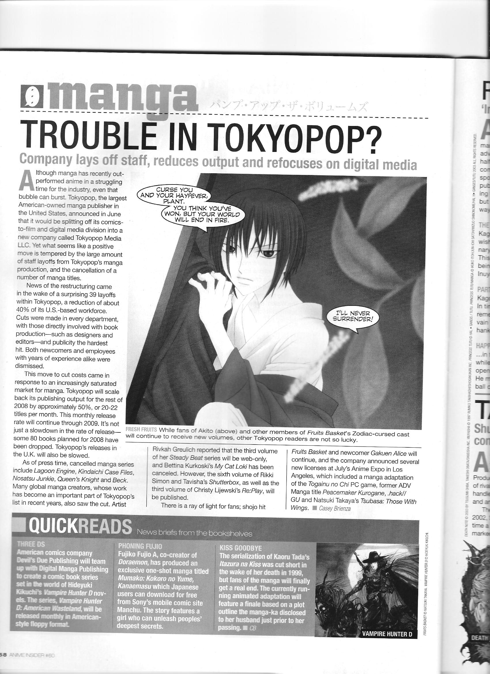 Via Anime Insider: Tokyopop Layoffs (September 2008) Posted on January 10, 2015 by torisunanohokori An article on Tokyopop’s severe downsizing that preceded its end as a company. Share this: Click to share on X (Opens in new window) X Click to share on Facebook (Opens in new window) Facebook Like Loading...