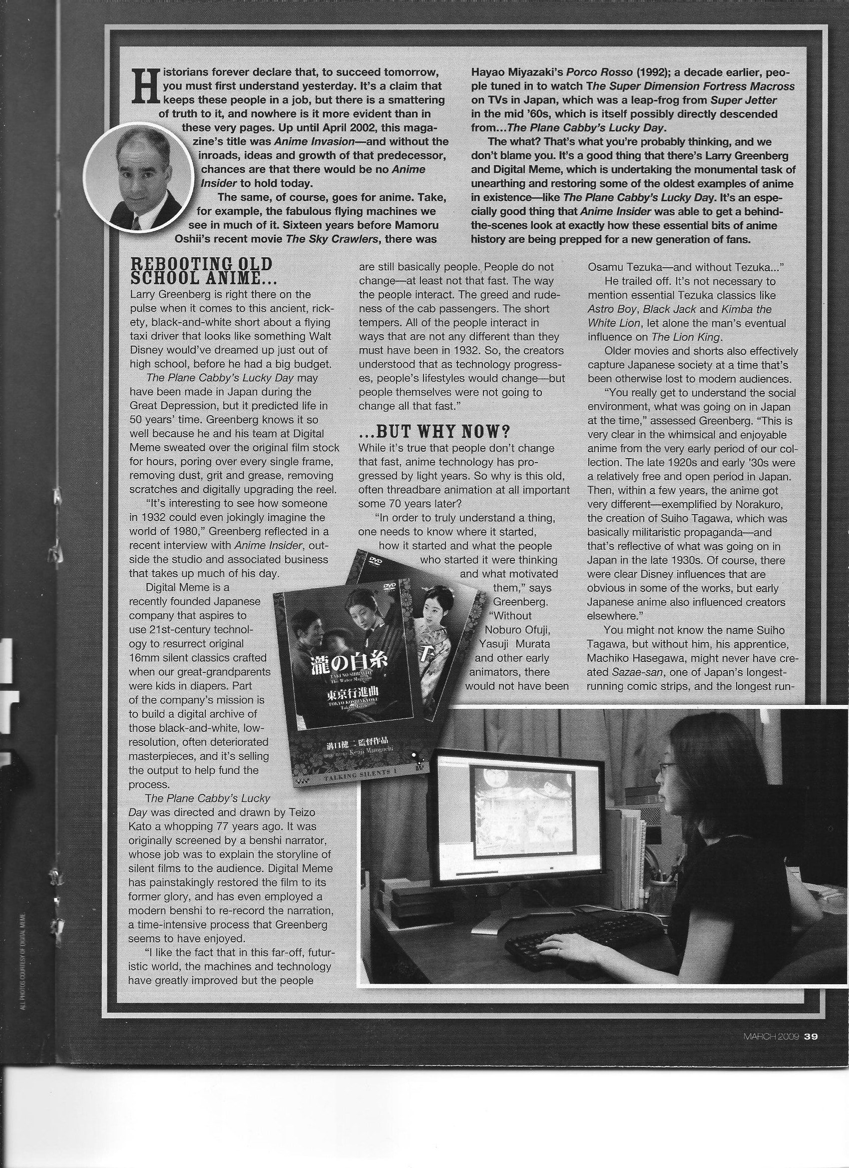 Via Anime Insider: Digital Meme (March 2009) Posted on January 11, 2015 by torisunanohokori An article on Digital Meme’s efforts to restore early-era anime films. Share this: Click to share on X (Opens in new window) X Click to share on Facebook (Opens in new window) Facebook Like Loading...