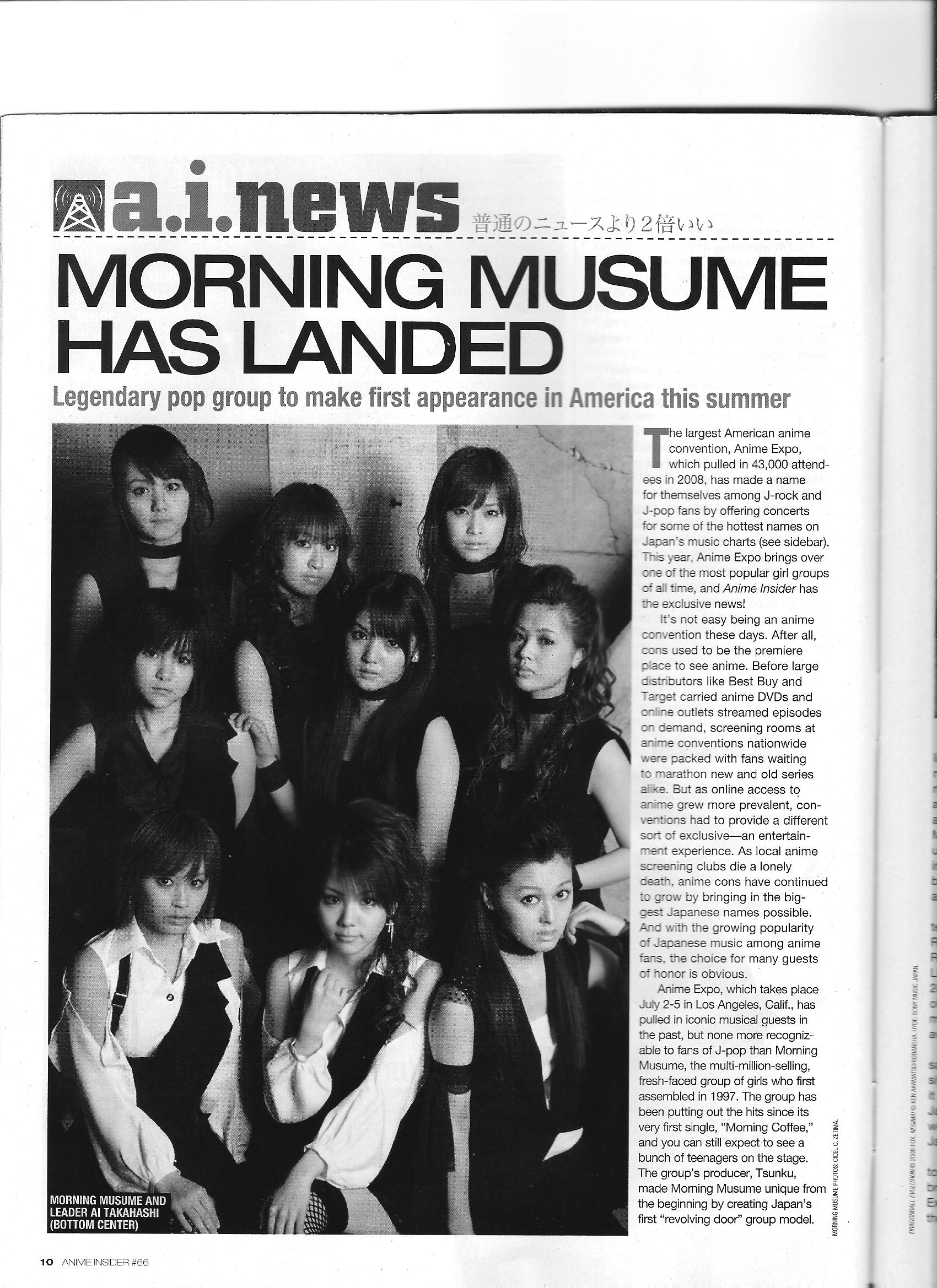 Via Anime Insider: Morning Musume (March 2009) Posted on January 11, 2015 by torisunanohokori A short article on a Morning Musume’s first visit to the US. Share this: Click to share on X (Opens in new window) X Click to share on Facebook (Opens in new window) Facebook Like Loading...