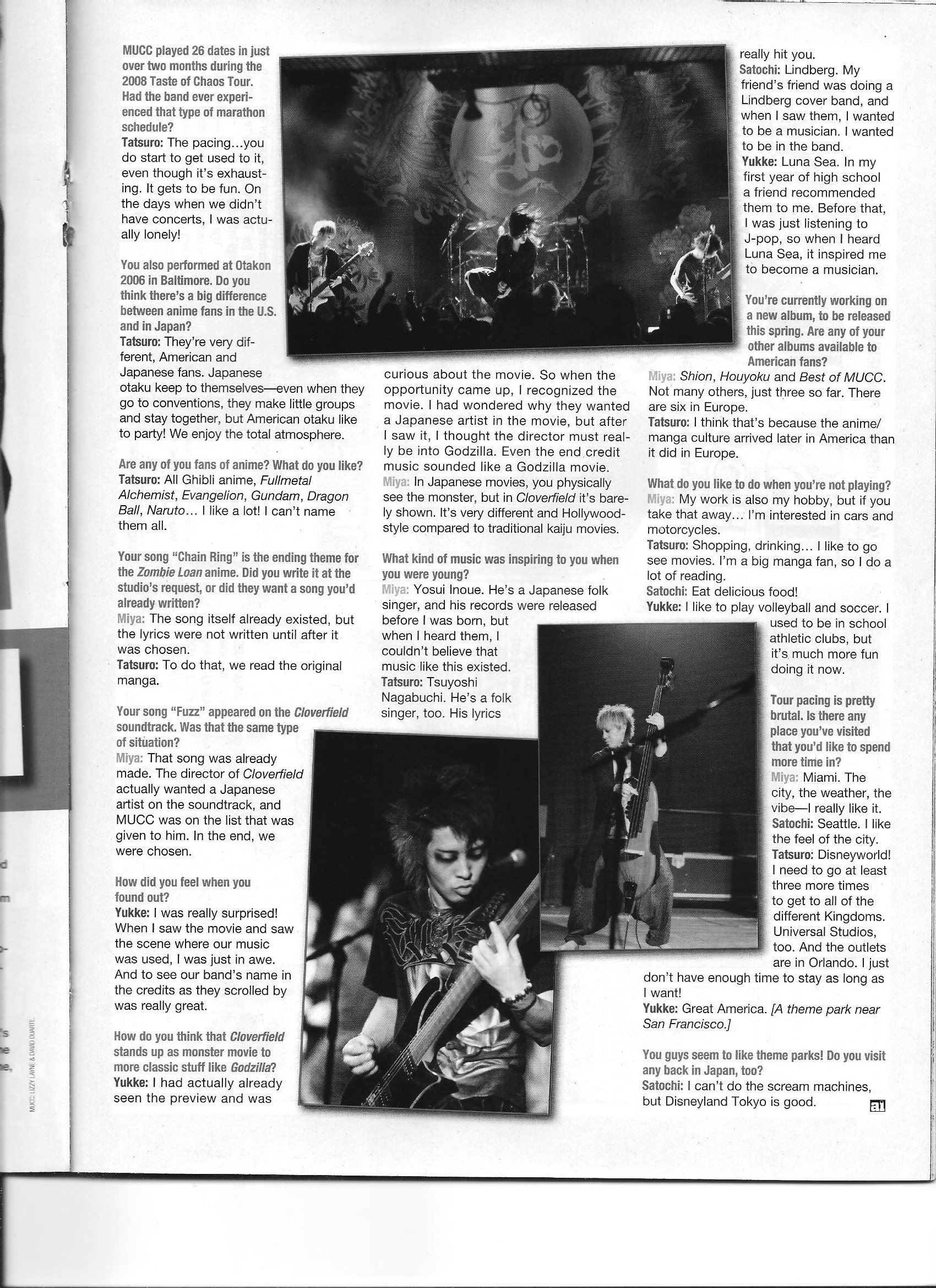 Via Anime Insider: MUCC (March 2009) Posted on January 11, 2015 by torisunanohokori An interview with the members of band MUCC. Share this: Click to share on X (Opens in new window) X Click to share on Facebook (Opens in new window) Facebook Like Loading...