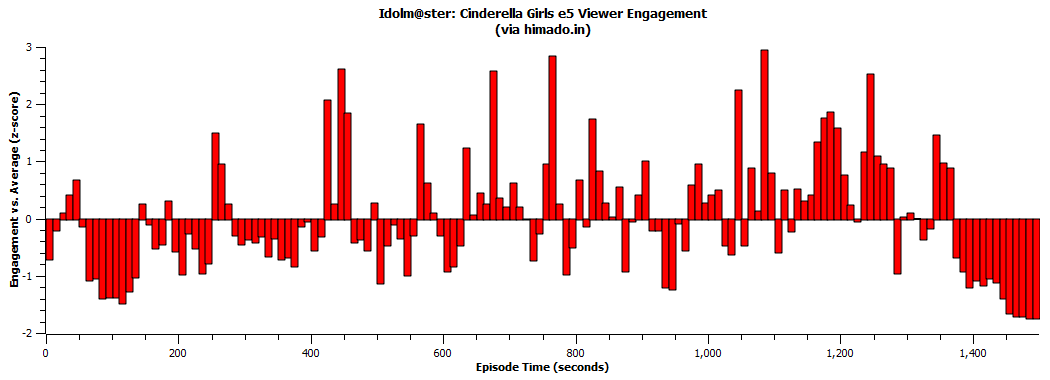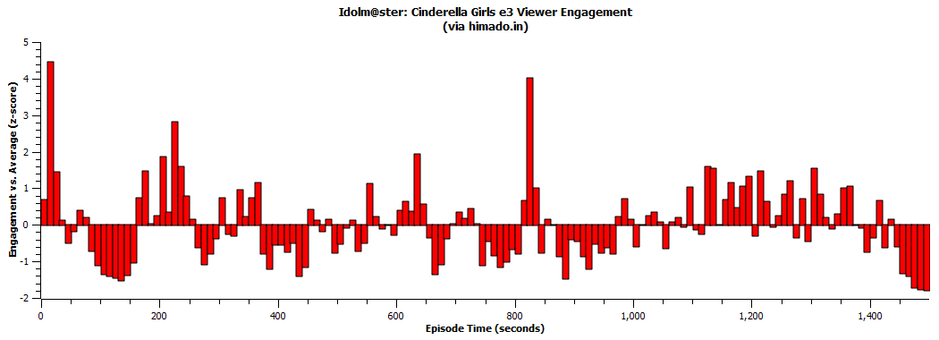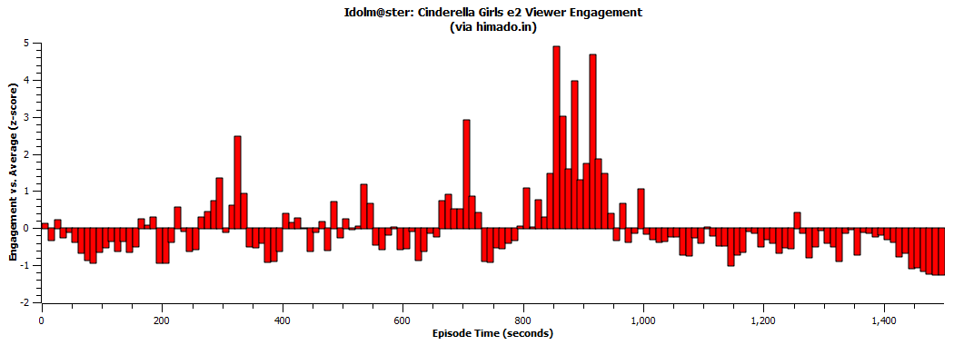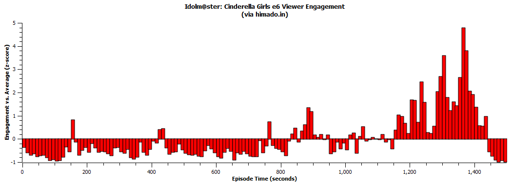 A couple of things stand out to me in these charts. First of all, the end of episode 6, punctuated by a New Generations debut that went worse than expected and a choked-up staredown between Mio and the Producer, set off a *really* long streak of continuously positive z-score – 290 seconds. That’s almost a full five minutes! Even excluding the 60-second irregular end credits, that’s still 230 seconds in length. It’s a level of sustained interest that doesn’t happen unless people are really keyed in to the moment.