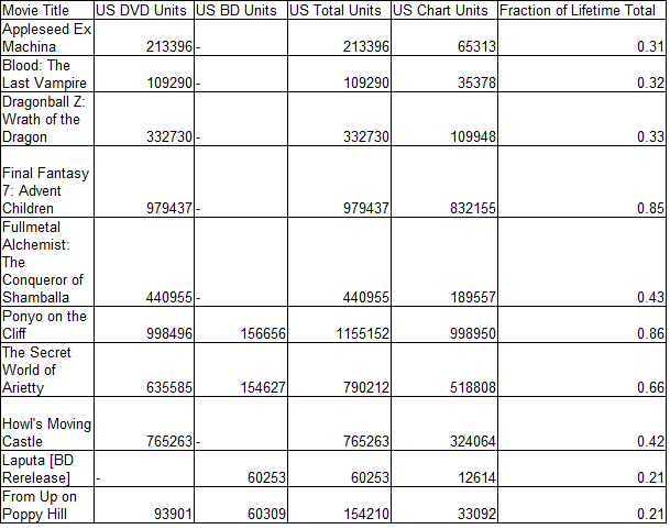 The Cat Returns, re-released in late June, sold less than I expected for a series that cracked the top 100 for multiple days. Given how Spirited Away also failed to parlay a release week in the top 20 to better than 30k sales, I suspect the competition at that time was weak enough to inflate both their rankings quite a bit. If these figures are accurate, they provide an interesting look at how mid-tier hits can perform beneath the thresholds.