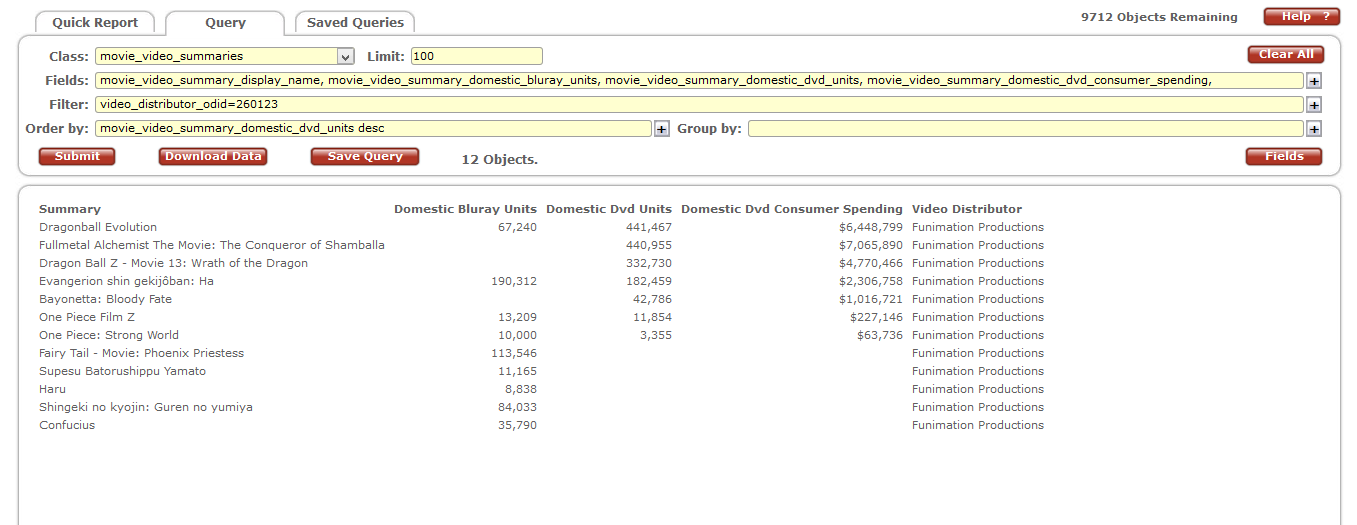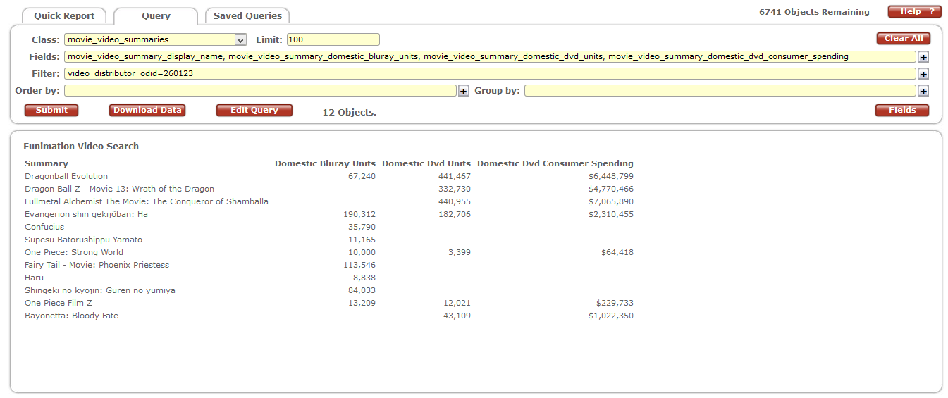 This was going to be all I was going to say for now, but I found a little something extra very recently. All data above was collected on August 20th. The Funimation search was useful enough to set to a default, so, on a whim, I went back and collected it 2 days later – and the numbers went up a little! Specifically, the numbers for just the DVD releases went up a little, while the BD numbers remained constant. August 21st happens to be the day TheNumbers updated with a new week’s worth of DVD data. So there might be something there, a way to see how series long since released and well below thresholds do on a weekly basis. If the system works the way I think it does, with OpusData and TheNumbers updating simultaneously, it should be possible to get reliable figures within roughly a month’s time.