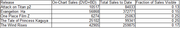 The info that can be gleaned from them is interesting, but let me just say right now that I’m really happy about the clerical error that logged Attack on Titan’s second set as a movie, and hence trackable long-term in the Opus database.