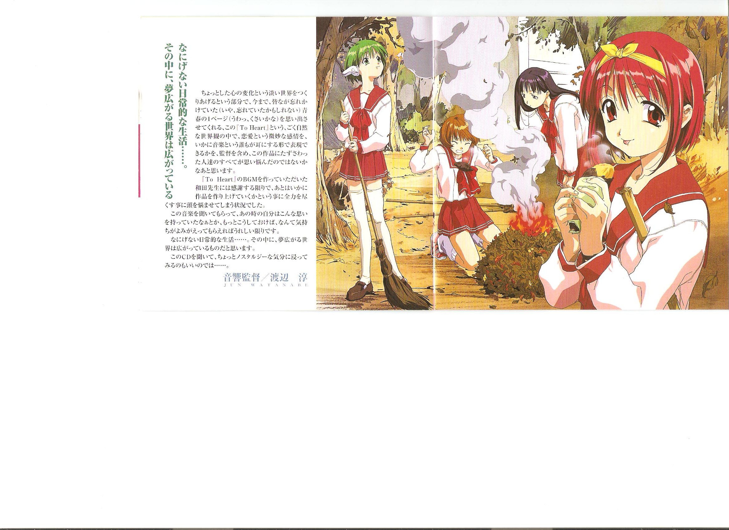 Main Text: Call it a slight change of heart in the name of the creation of a slight world, one page of spring (wow, that’s lame) that, by now, everyone had long been on the verge of forgetting (no, even forgot already), but will now remember. That is this To Heart; within a natural world, this mysterious and delicate feeling of romance is exquisitely expressed by music. When anyone, including the director, hears this upon their ears, they will perhaps begin to worry over their emotions, I think.