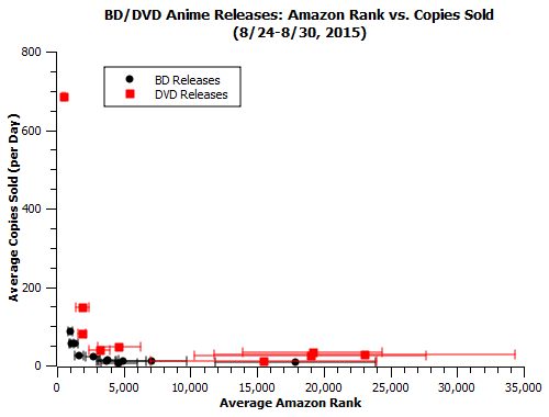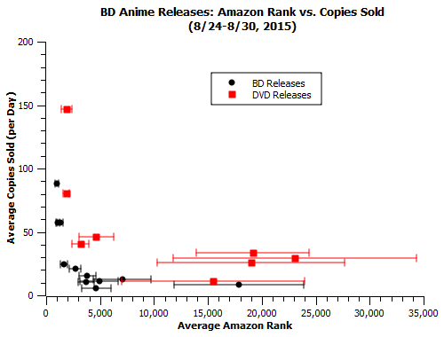 What immediately pops out at you in both of these graphs is that, for a given average amazon rank, DVDs are selling 2-3 times as much as BDs. This is trueboth for releases with BD/DVD combo packs, and ones like One Piece Film Z where the BD and DVD releases are entirely separate. The one exception there is One Piece Strong World.