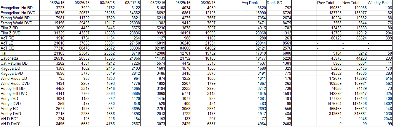 Now that the Nash Information Services database has been updated with data for that week, we can start to take those numbers and try to dissect what they mean. As a happy accident, Vampire Hunter D’s rerelease charted in the same week and we can include that bit of data from late-August tracking as well.