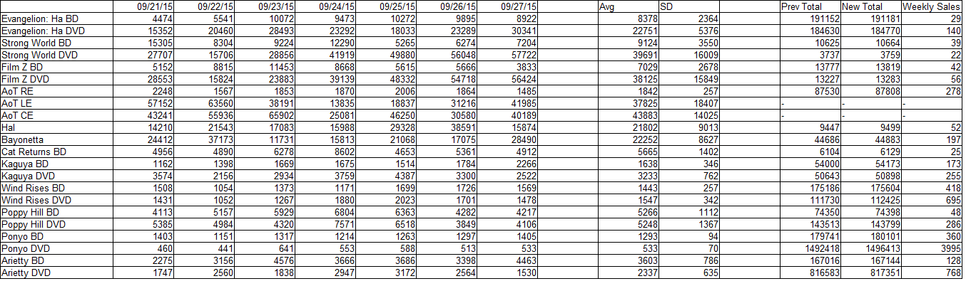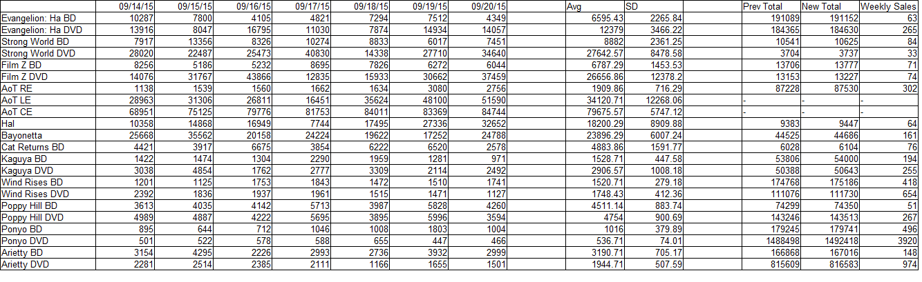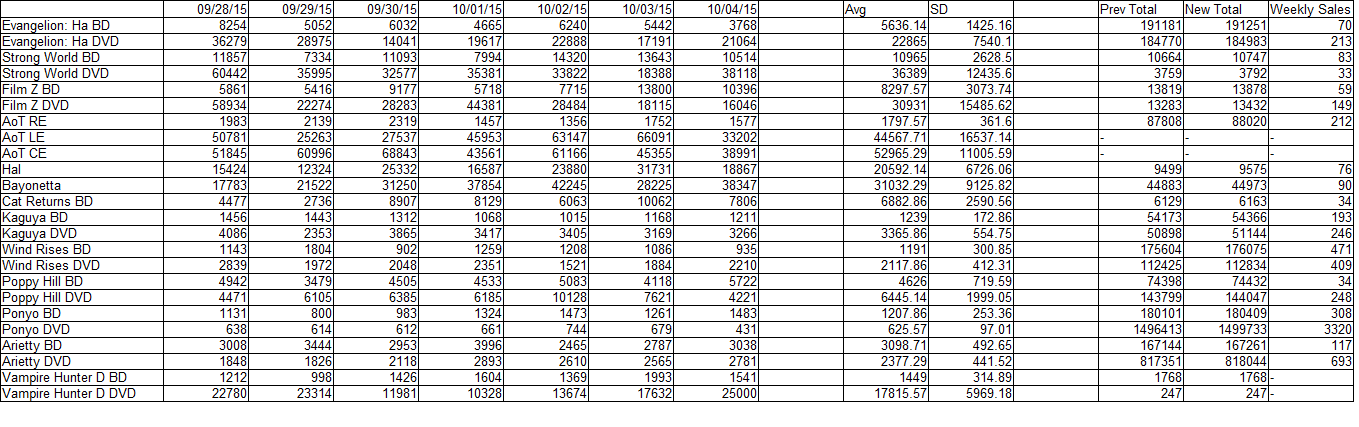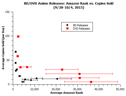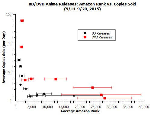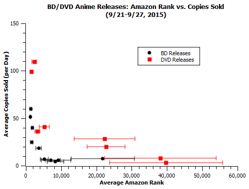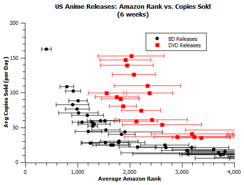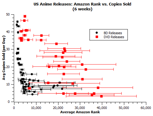 -As the weeks of data have piled up, we’ve filled in both ends of the ranking scale, especially for DVD releases, where the ghibli releases have nicely filled in the #1k-#10k range while the less-mainstream funimation titles have flitted around the #10k-#50k area. (BD data is still kinda blank beyond the #20k range). What we see in that previously invisible #10k-#50k area is something we’ve come to expect from months of observation of stock totals – releases that approach #40k in average weekly rank very quickly drop off to a number close to zero copies sold, a number that would likely just be zero if they weren’t averages including the one odd day the release made it up to #10k. This is good confirmation to have about something we were already kind of sure about.