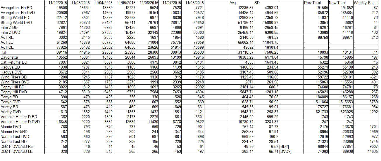 For comparison, the BD column had about 1094 copies each day in sales, and the DVD coulmn had about 147 copies each day. So the BD column has to contain the RE for things to make sense this week. DVDs would also be severely underestimated if it were just the DVD editions in that column, so add the LE into that column. So my working theory is that, for DBZ:F, DVD=DVD+LE sales and BD=RE sales.