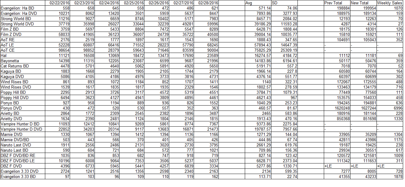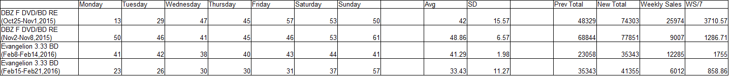 So, um, it’s almost well into May and I’ve been molasses with updates, being busy in a good way in life and other hobbies. I kept up the tracking and the data doesn’t change, so I was never particularly motivated to sit down and finish this up. Even though it contains 4 weeks of a new volume (Eva 3.33) selling fairly well, and all. It’s here now, though.