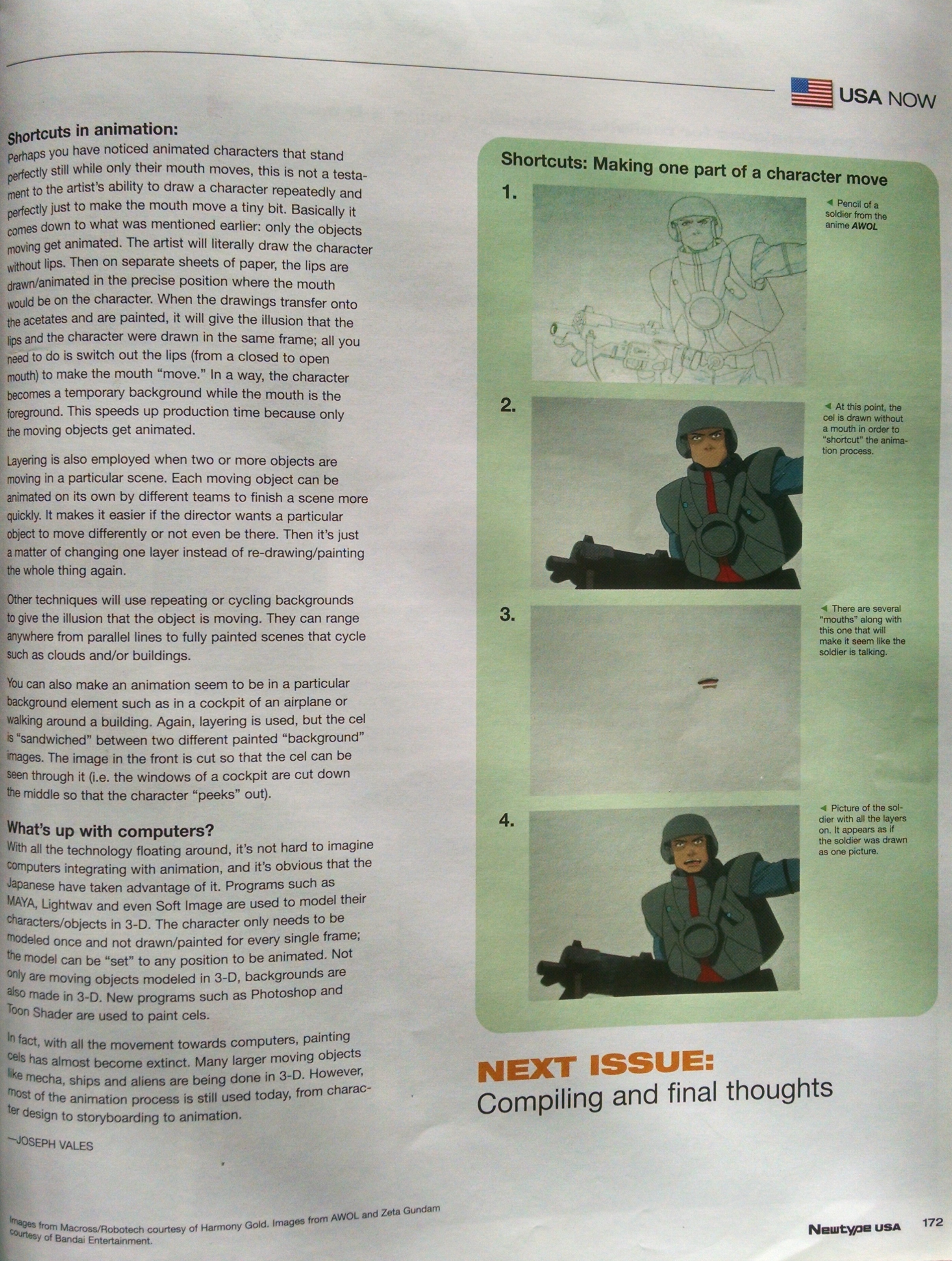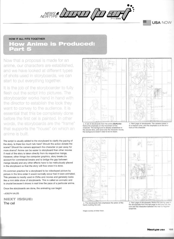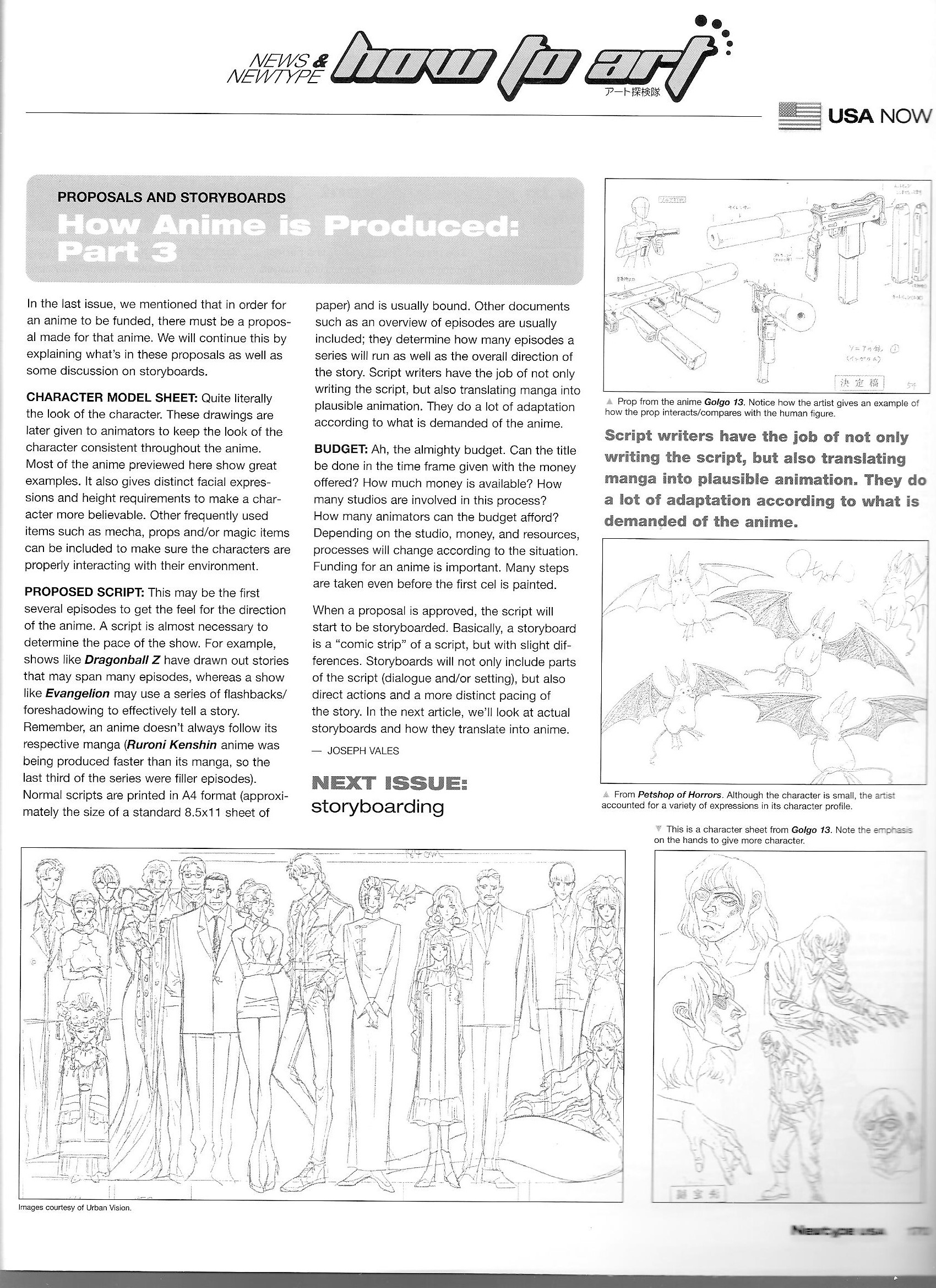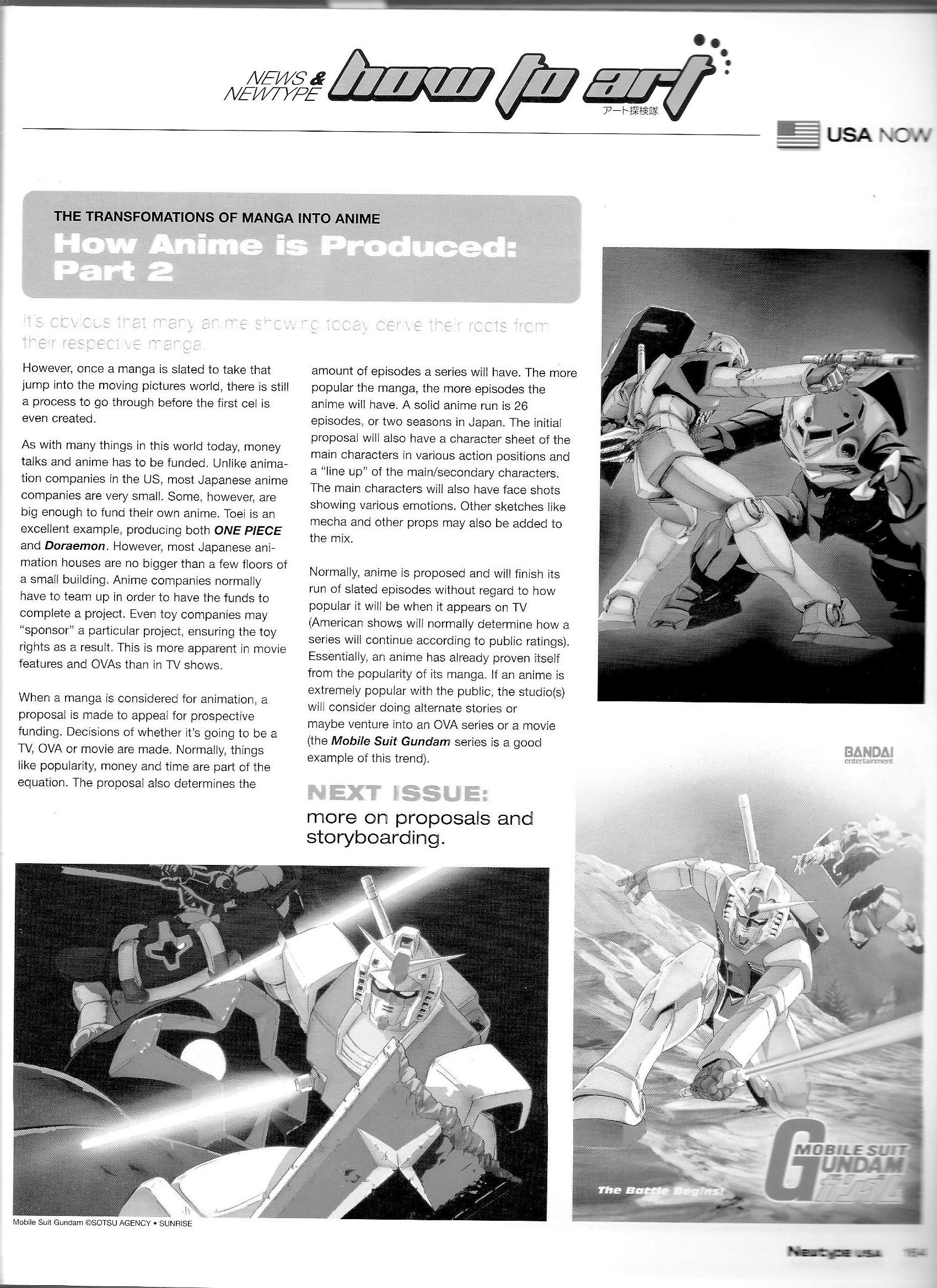 Via Newtype USA: Anime Production Steps (December 2002 – April 2003) Posted on April 26, 2017 by torisunanohokori Articles I had scanned and lying around since forever ago, but never bothered to upload since I’m missing the issues containing steps 1 and 7 and stopped collecting the magazines a while ago. I’m uploading them now. Share this: Click to share on X (Opens in new window) X Click to share on Facebook (Opens in new window) Facebook Like Loading...