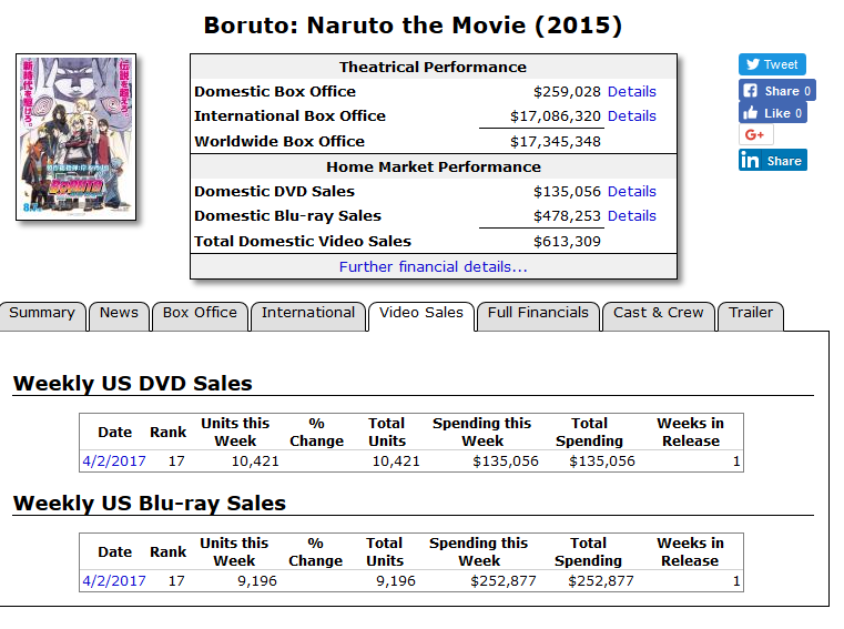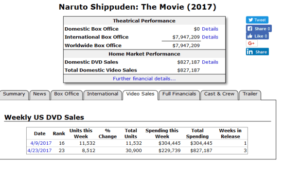 I went combing through the US BD/DVD charts for April, and I found a pair of interesting results. First, the Boruto movie sold 19,617 copies (10,421 DVDs, 9196 BDs) in its first week out. Second, the 30th DVD box set for Naruto Shippuden, which came out on April 4th, sold 11,532 copies in its first week, 30,900 copies over 3 weeks.