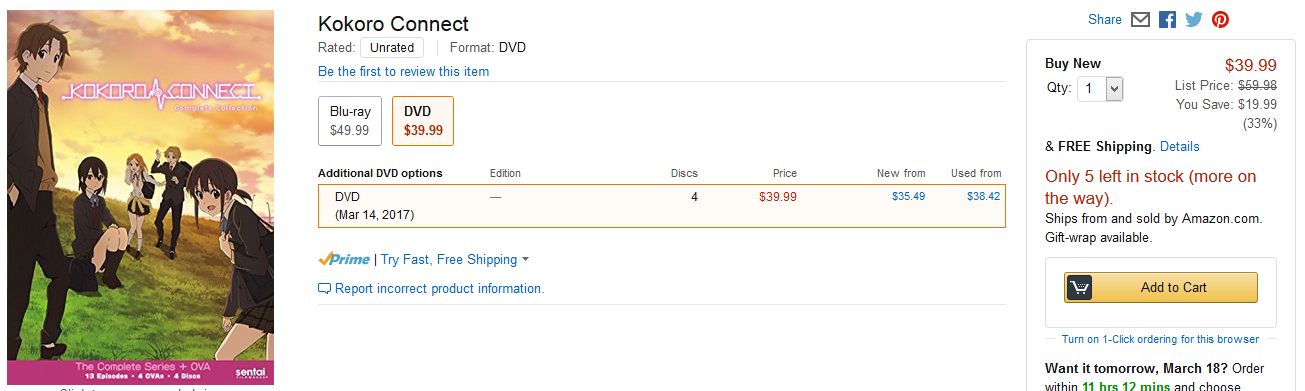 This is a fairly minor bit of news, but it’s a benchmark that’s at least mildly noteworthy. Kokoro Connect was rereleased as a full 17-episode series in both BD and DVD formats on March 14th, 2017. The TV and OVA series had previously been released in separate collections. This particular collection is noteworthy because the DVD version has thus far gone unranked among products on amazon, indicating there have been zero preorders or purchases of the product. The initial price was the MSRP of $60, but, on the 17th, the price was cut by 33% to $40. On the same day, Amazon began listing that there were 5 copies remaining in stock, and the collection remains unranked. So there you go, one solid example of how much DVDs initially stock on Amazon. It may not be indicative of the overall market as a rerelease, but this minor discovery takes us from 0 datapoints to 1.